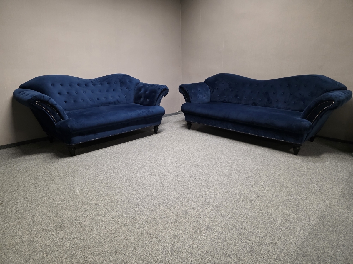 Zánovní (neponičené). Potah látka, celočalouněné. Nohy masiv. Nerozkládací, cena dohromady. Velký gauč: délka 235 cm, hloubka 97 cm, výška 93 cm, výška sedáku: 46 cm, plocha sedáku: 68x160 cm. Malý gauč: délka 200 cm, plocha sedáku: 68x125 cm, výška nohou: 16 cm.