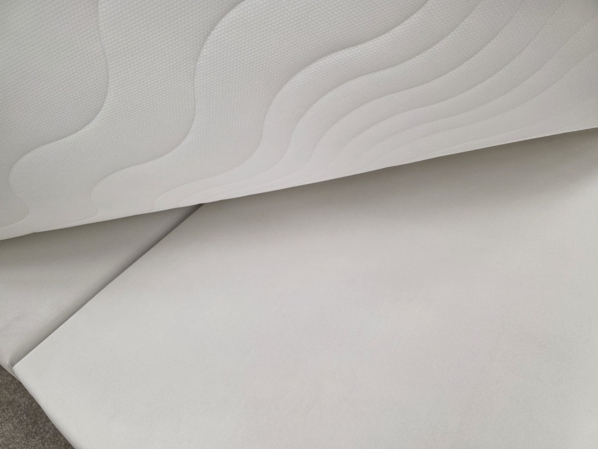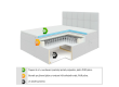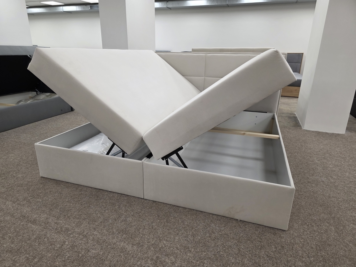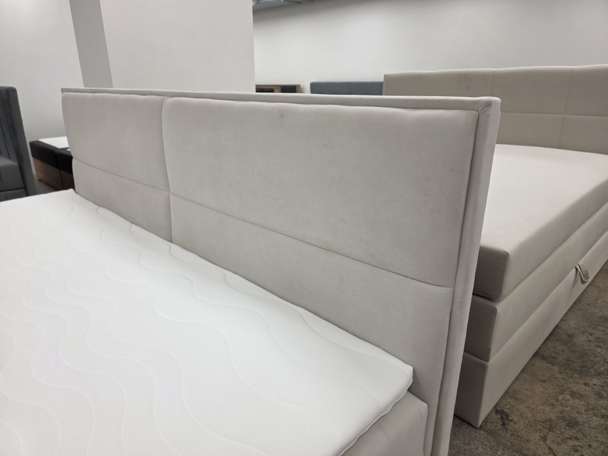 Potah semiš. 2x úložný prostor, včetně topperu. Lůžko 200x200 cm, výška lůžka 58 cm, výška čelo: 108x205 cm.