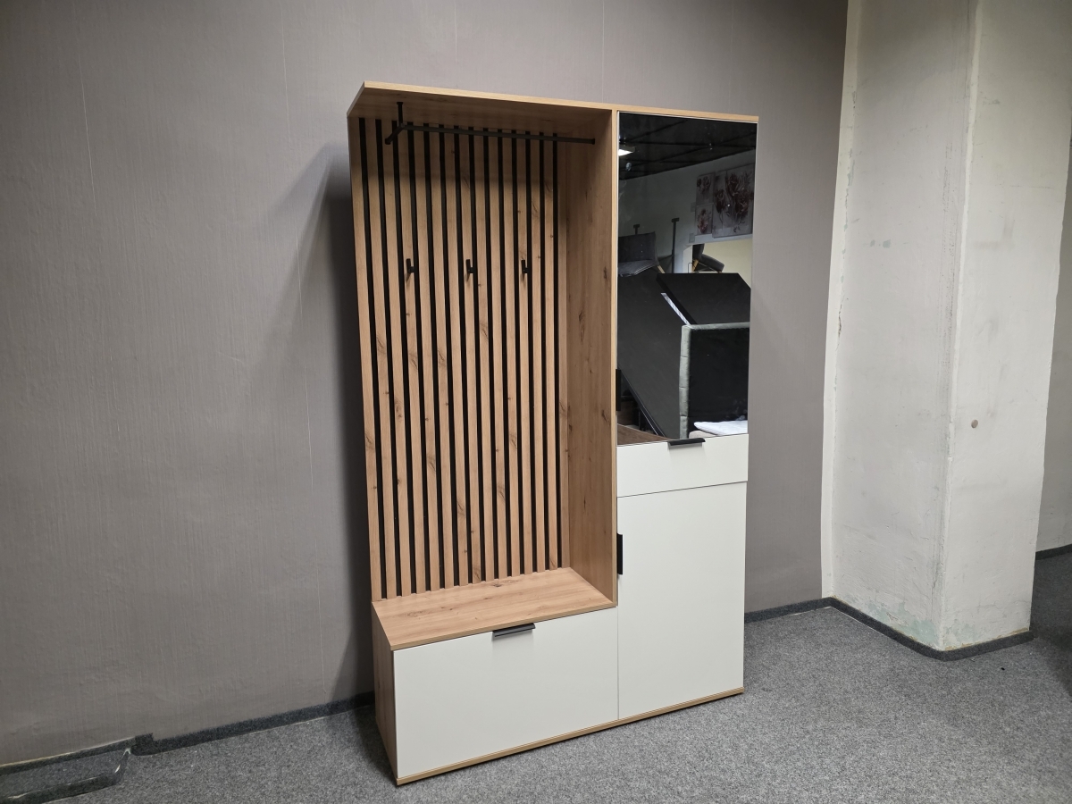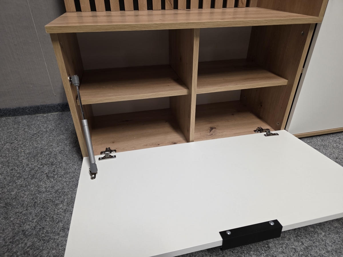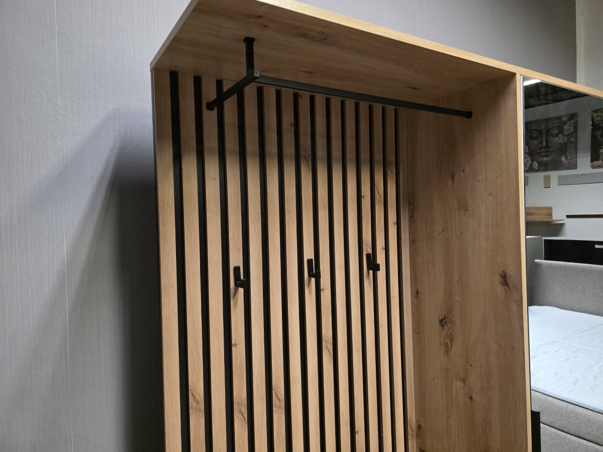 II. jakost (oděrka viz foto). Materiál lamino, MDF. Kovové doplňky. Délka 122 cm, hloubka 35 cm, výška 195 cm. 200,50,20/60