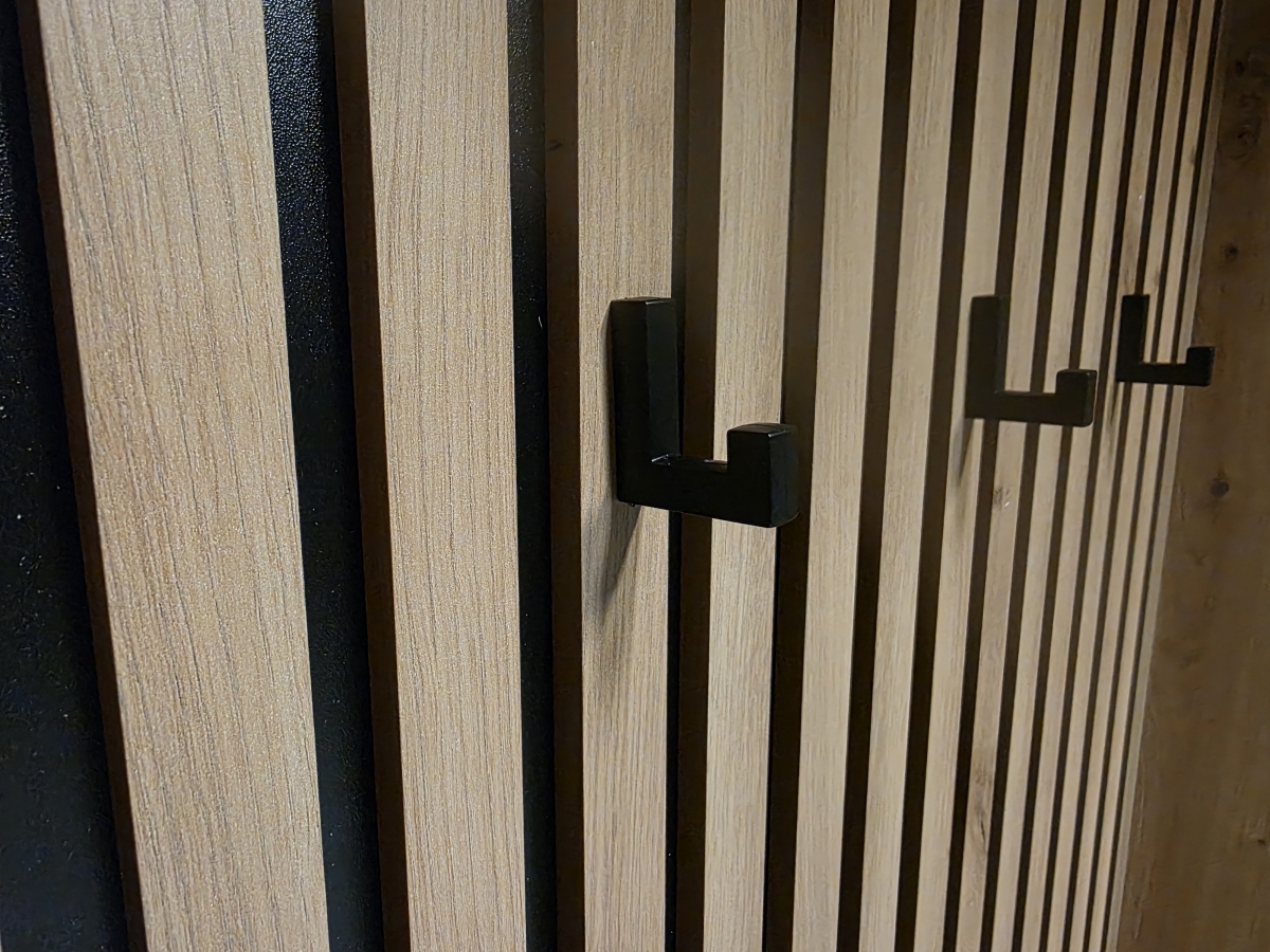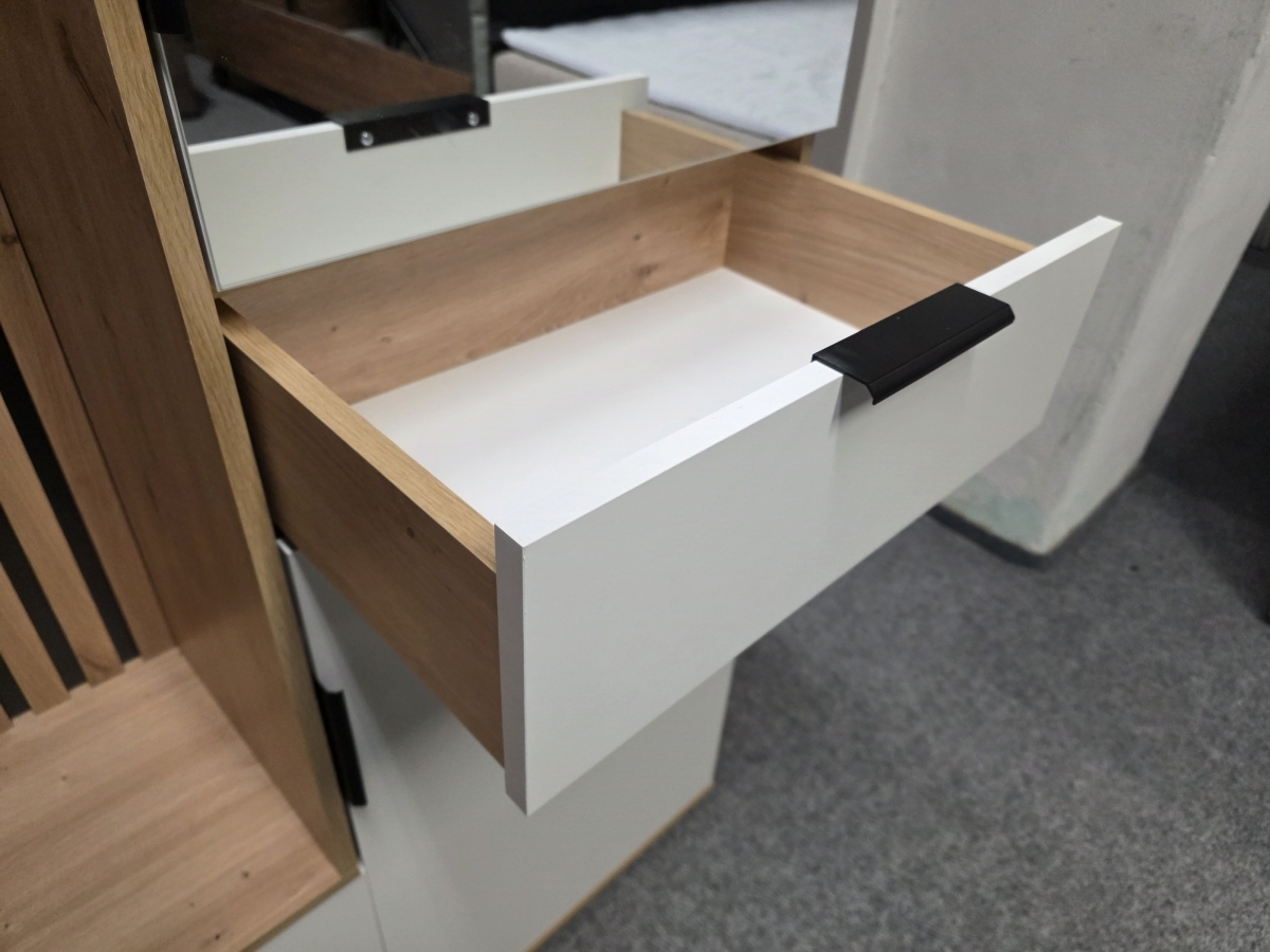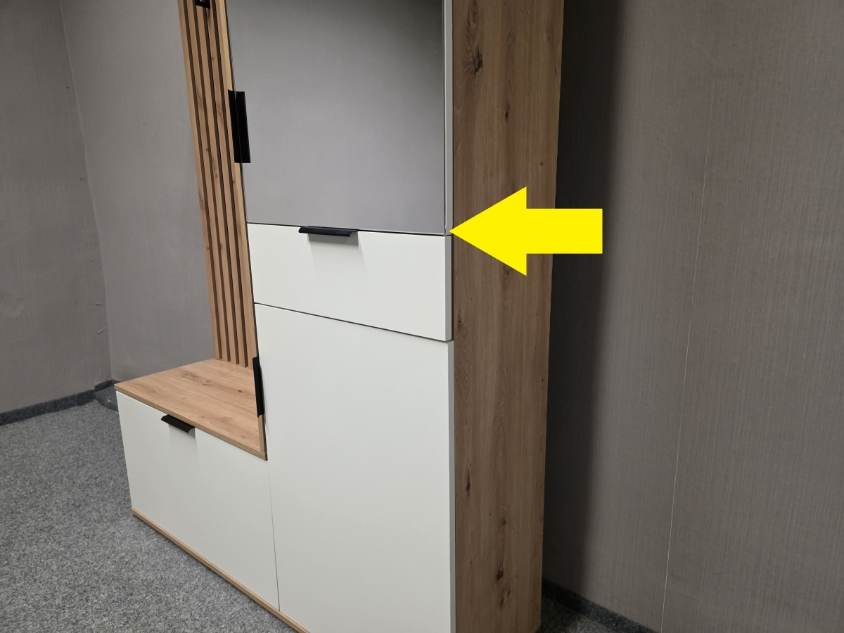 II. jakost (oděrka viz foto). Materiál lamino, MDF. Kovové doplňky. Délka 122 cm, hloubka 35 cm, výška 195 cm. 200,50,20/60