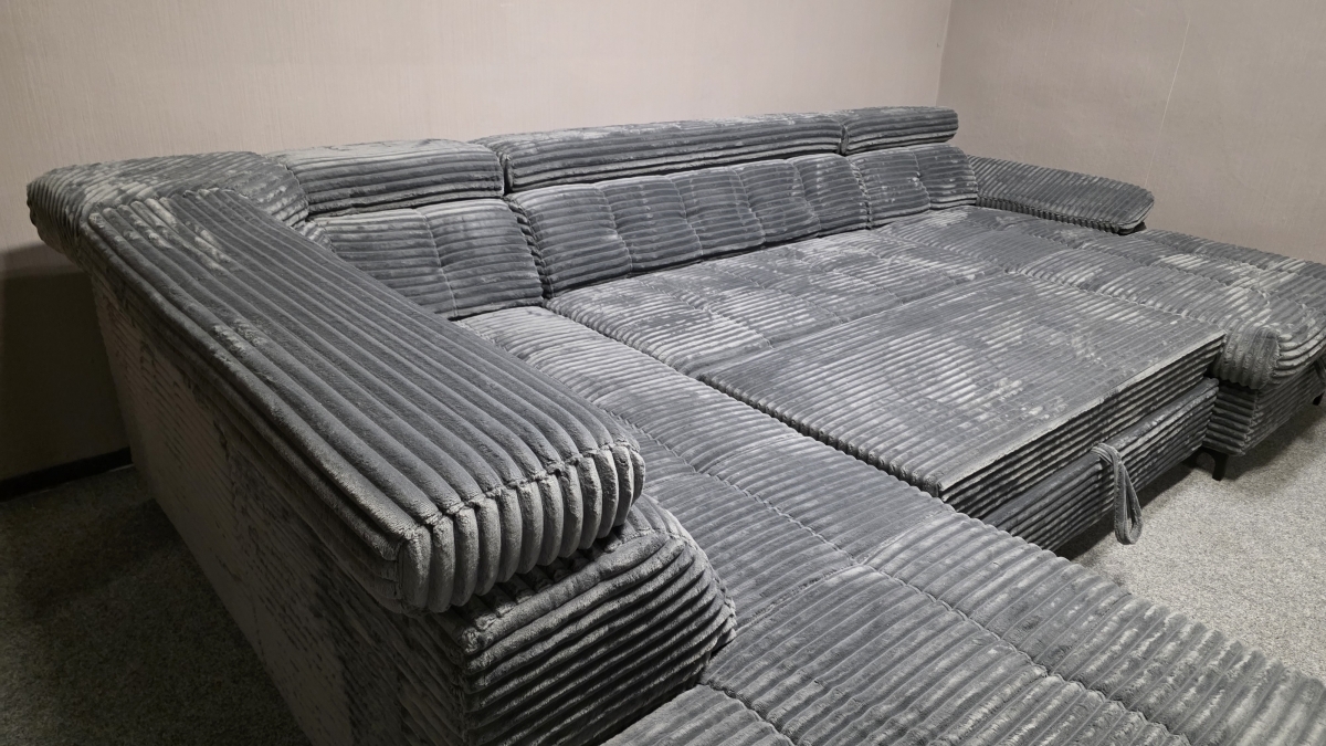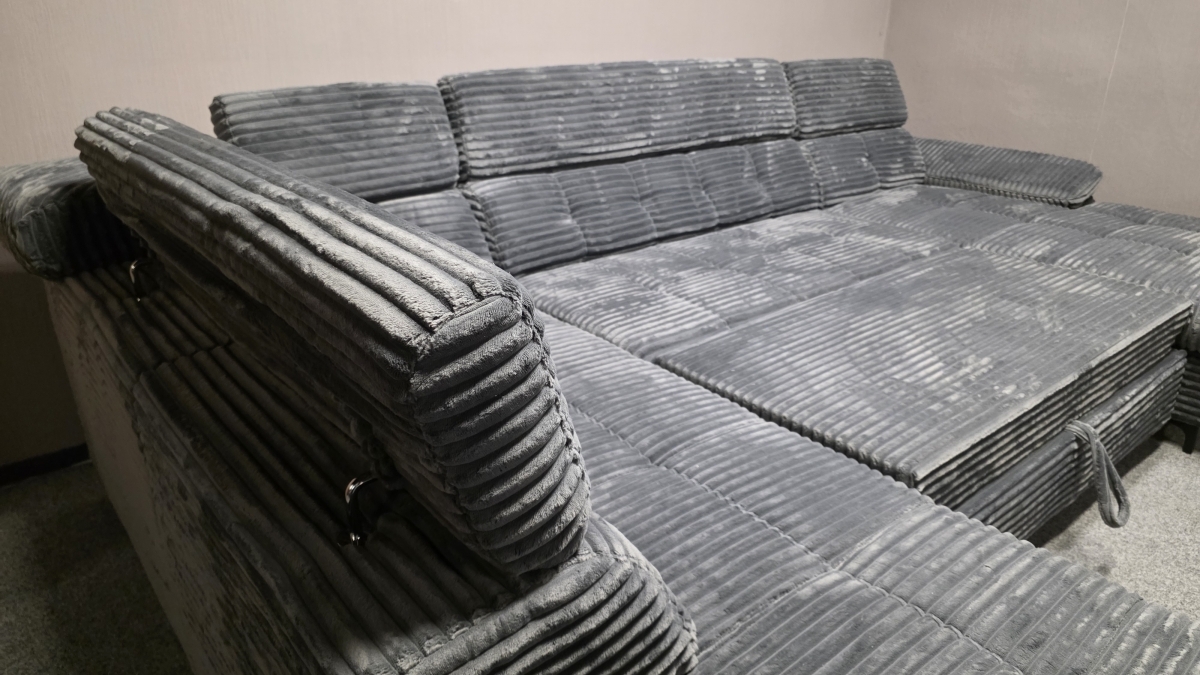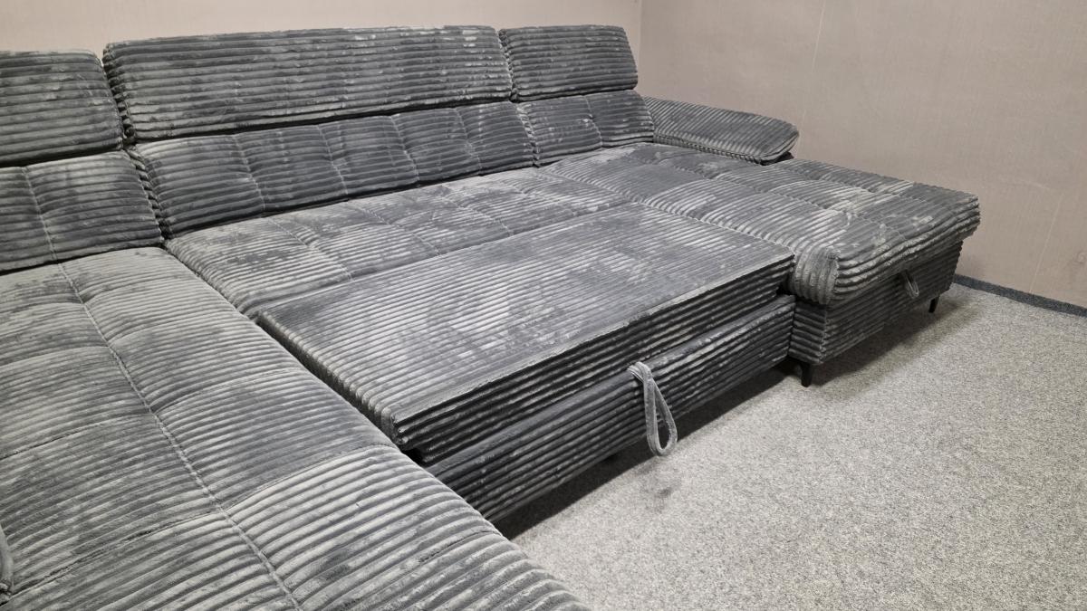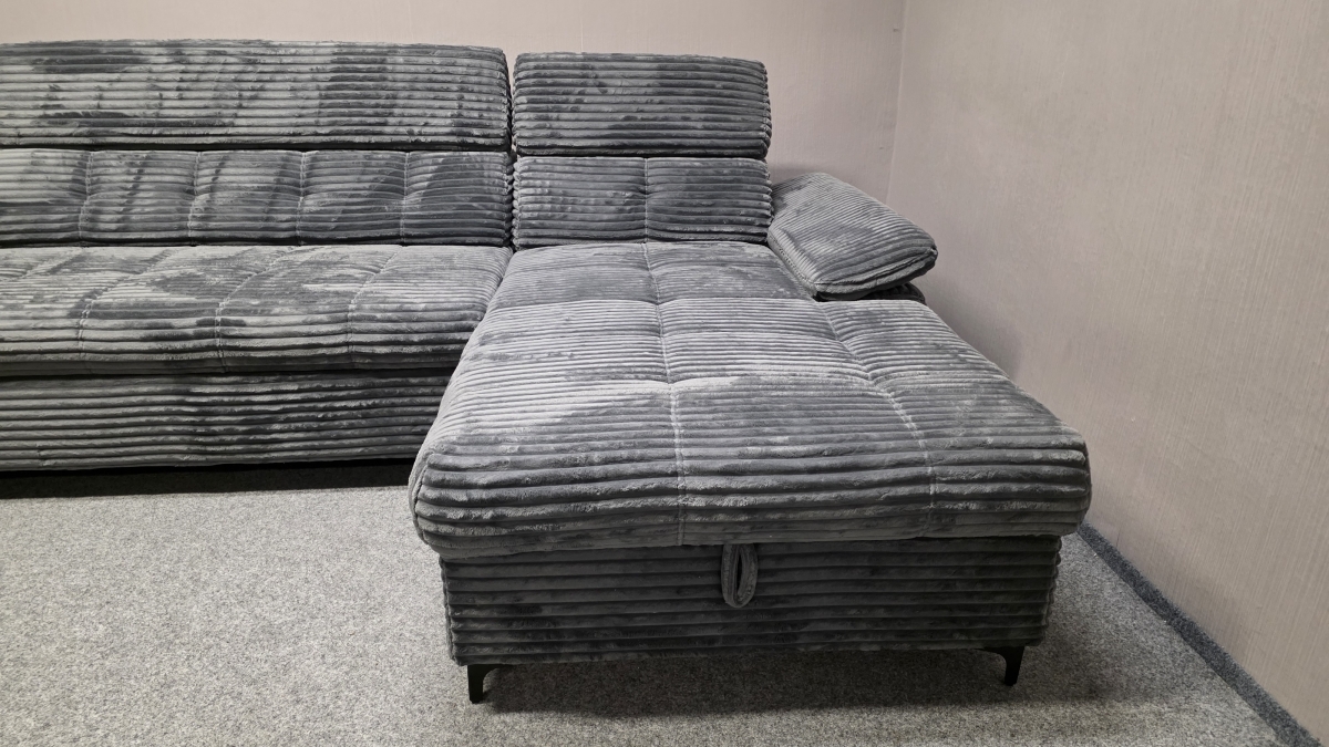 Potah manšestr TEDDY, celočalouněné. Rozkládací, úložný prostor, polohovací opěrky hlavy a rukou. Zprava: 175x345x230 cm, lůžko: 120x270 cm, výška 82-97 cm, výška sedáku: 47 cm, hloubka sedáku: 58 cm, prostor pro konferenční stolek: 136 cm.
