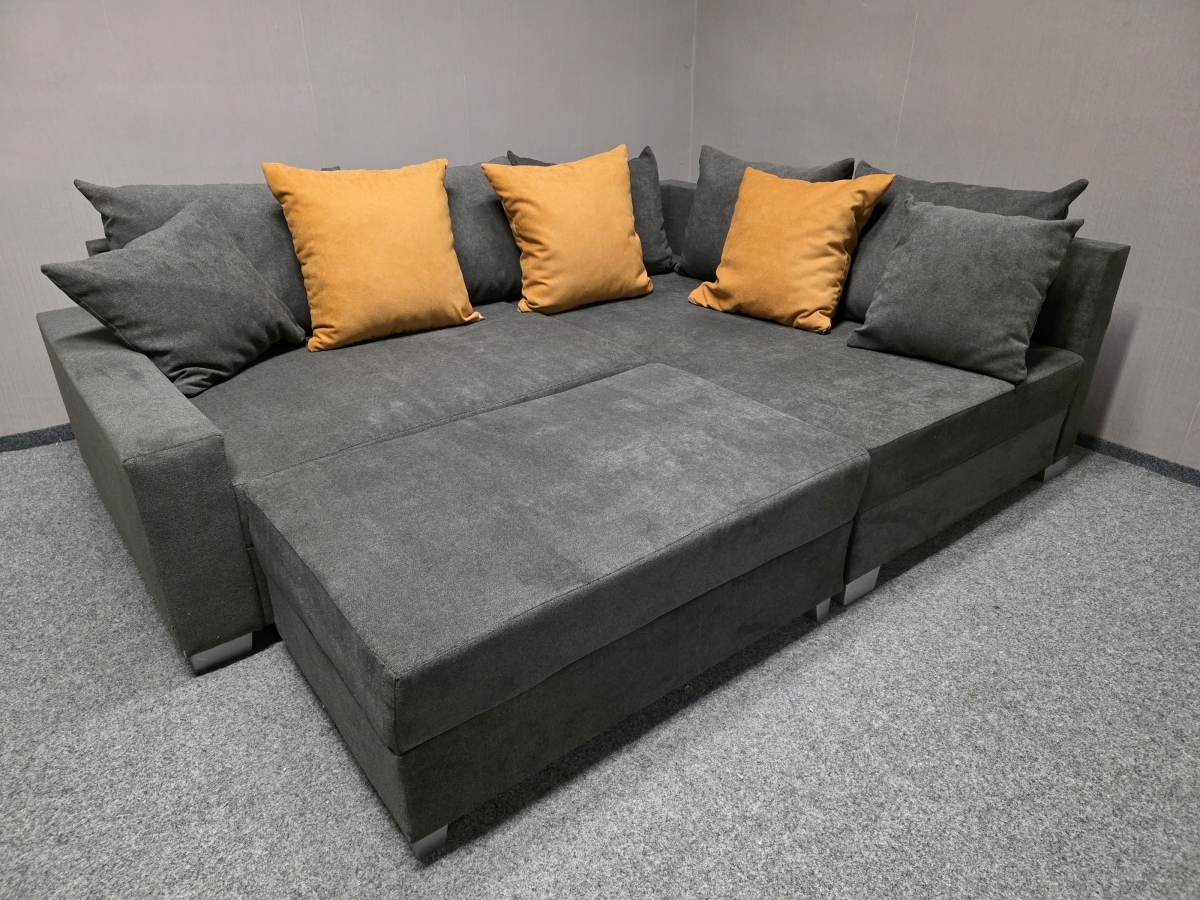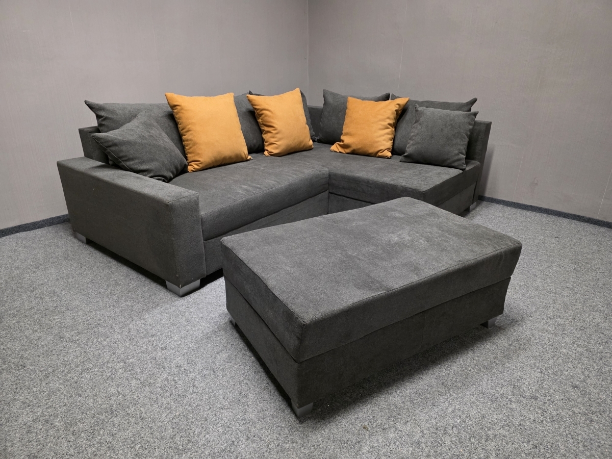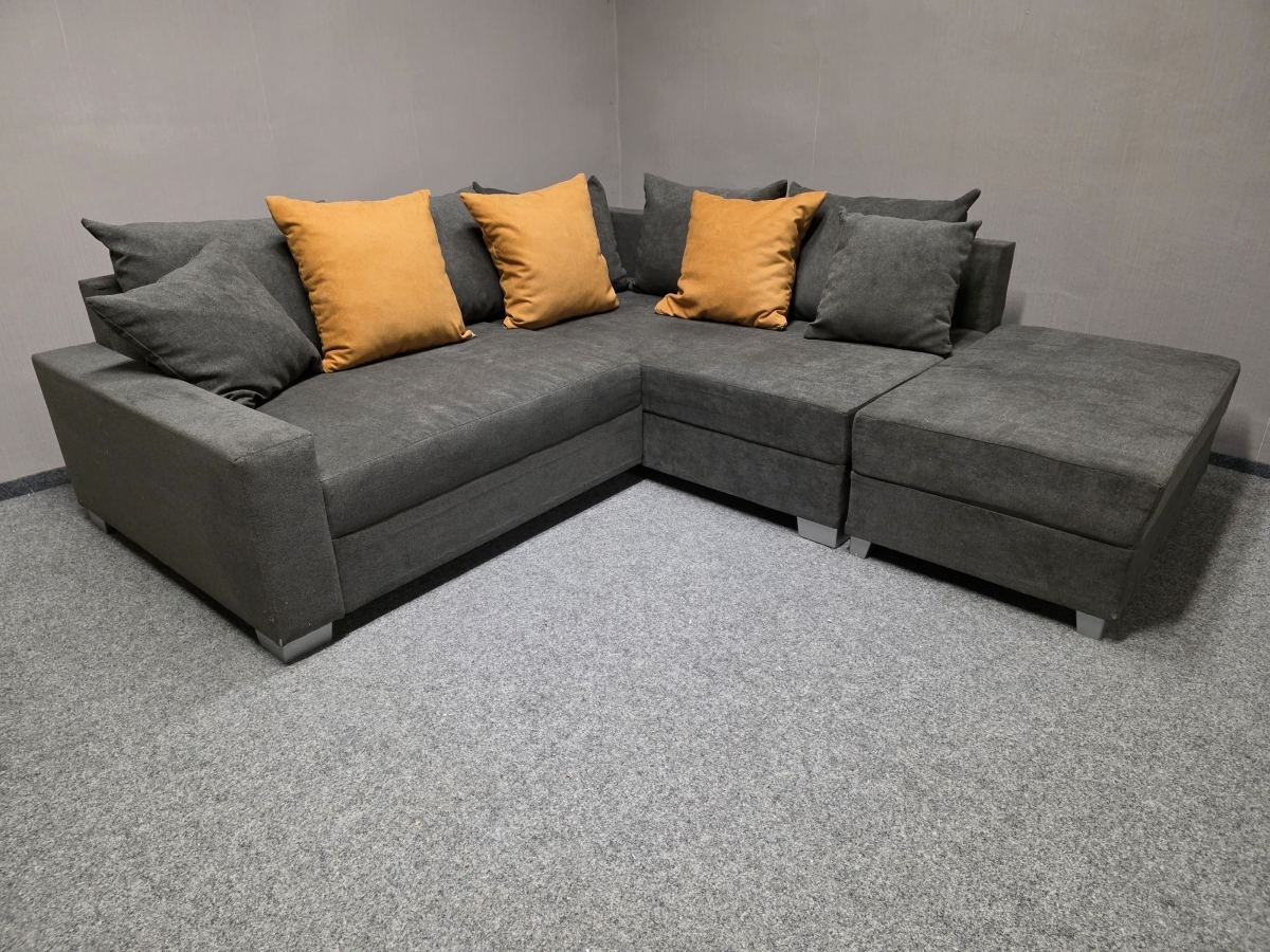 Nová malá rohová sedačka s polštáři šedooranžová