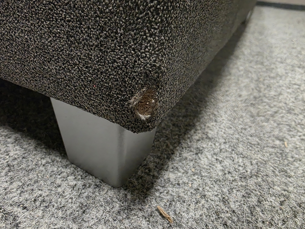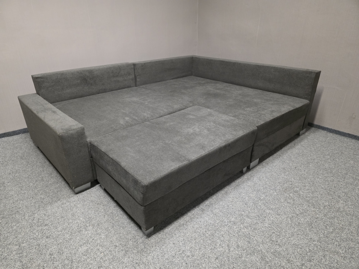 II. jakost (poničení viz foto). Potah látka. Po přisunutí taburetu vznikne lůžko. Zprava: 168x220 cm, lůžko: 160x195 cm, výška 65 a 85 cm, výška sedáku: 41 cm, hloubka sedáku: 50-95 cm.