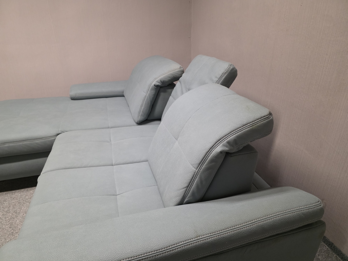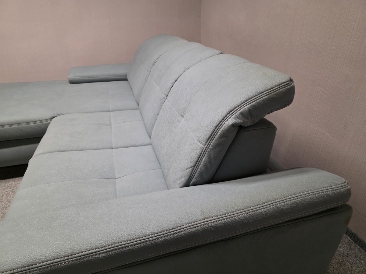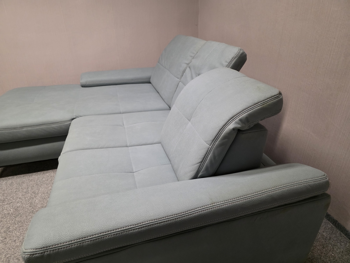 Vystavený kus. Potah vysoce kvalitní silná látka MAMMUT, celočalouněné. Značka POLIPOL. Nerozkládací, úložný prostor, posuvná opěradla, polohovací opěrky hlavy. Zleva: 195x235 cm, výška 87-101 cm, výška sedáku: 49 cm, hloubka sedáku: 57 a 78 cm, výška nohou: 11 cm.
