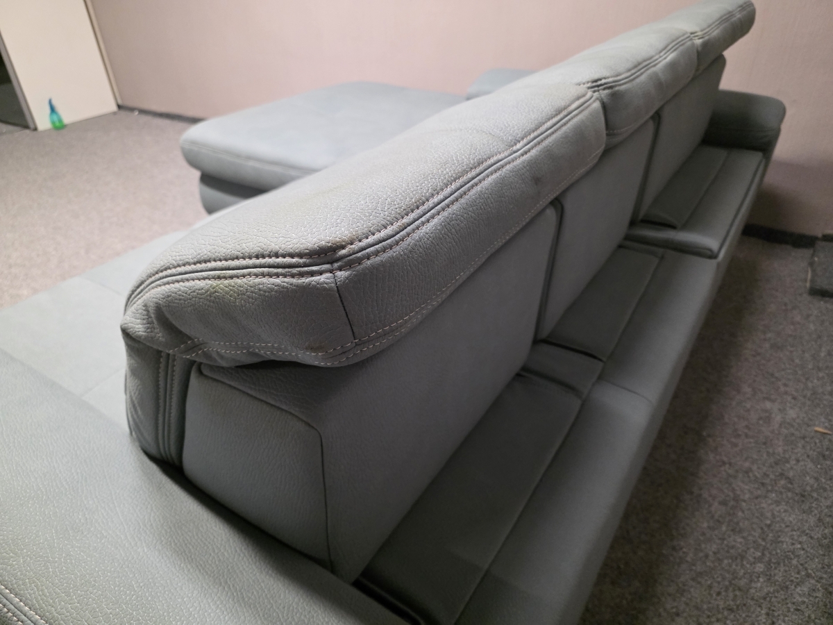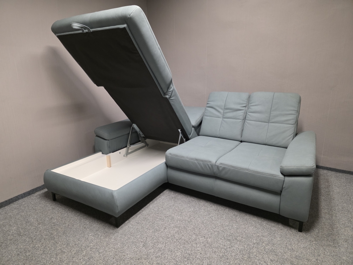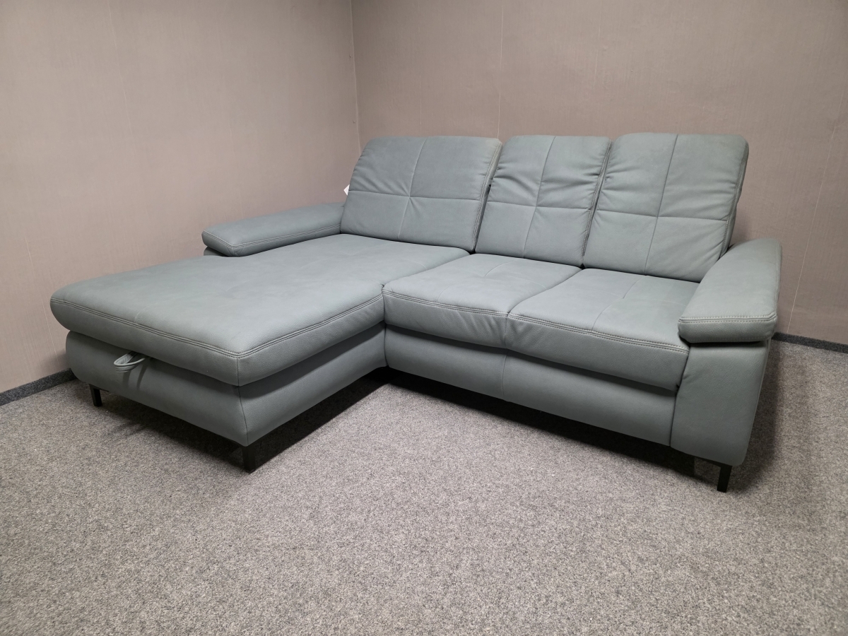 Vystavený kus. Potah vysoce kvalitní silná látka MAMMUT, celočalouněné. Značka POLIPOL. Nerozkládací, úložný prostor, posuvná opěradla, polohovací opěrky hlavy. Zleva: 195x235 cm, výška 87-101 cm, výška sedáku: 49 cm, hloubka sedáku: 57 a 78 cm, výška nohou: 11 cm.