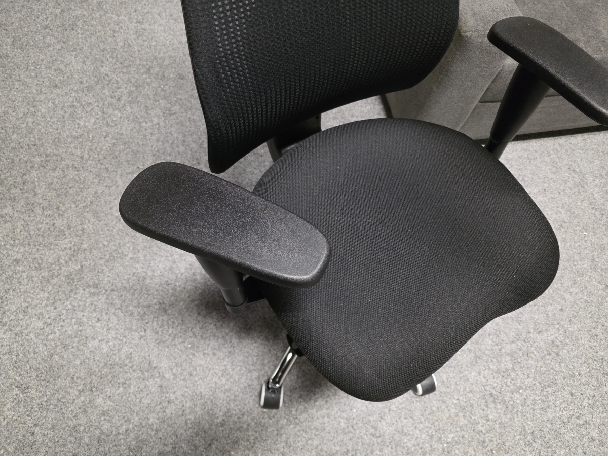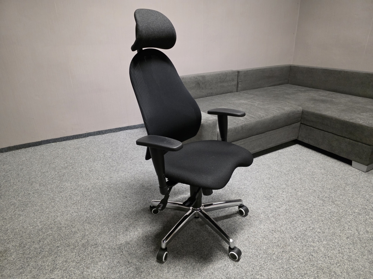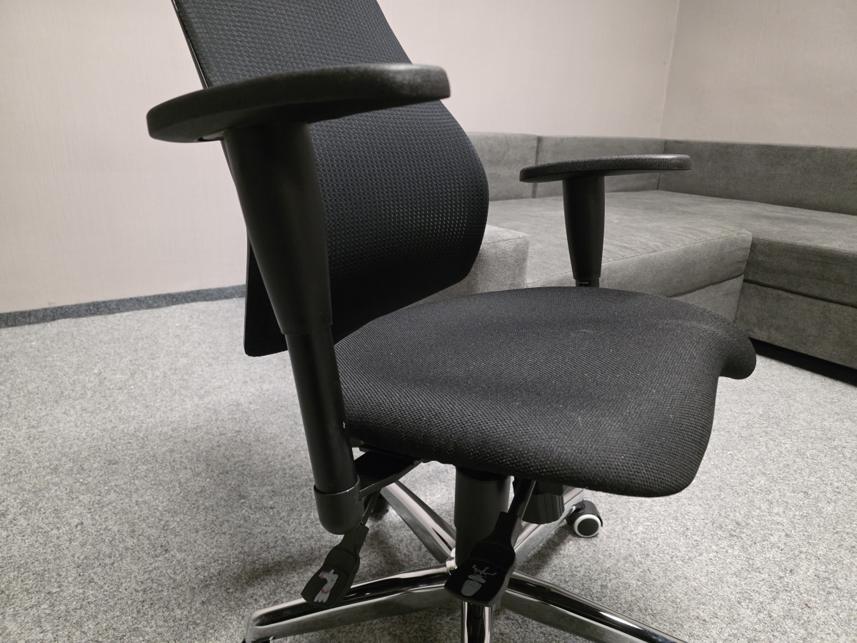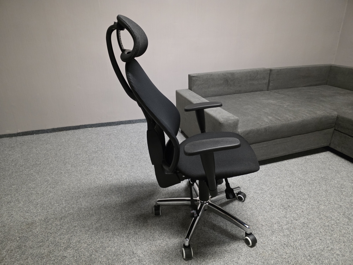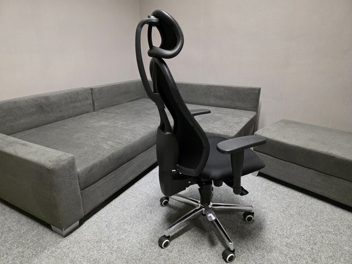 Vystavený kus. Potah hladká tkanina. Nosnost 110kg. Zvedací, polohovací, houpací, výškově nastavitelné opěrky rukou, otočné opěrky rukou, polohovací opěrka hlavy. Šířka 65 cm, hloubka 60 cm, výška 127-137 cm, výška sedáku: 50-60 cm.