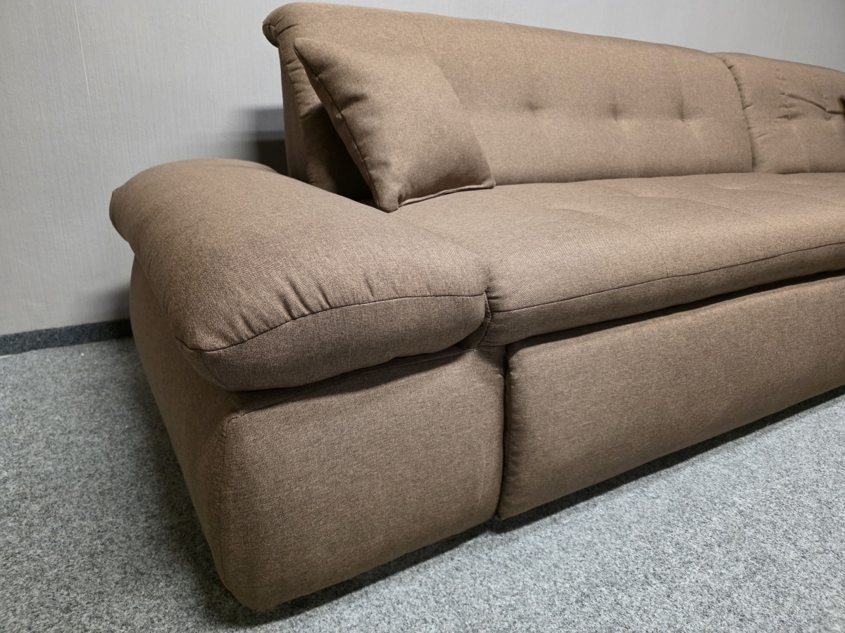 Potah látka, celočalouněné. Rozkládací, polohovací opěrky rukou. Včetně polštářků. Zleva: 170x298 cm, lůžko: 120x220 cm, výška 80 cm, výška sedáku: 44 cm, hloubka sedáku: 56 cm.