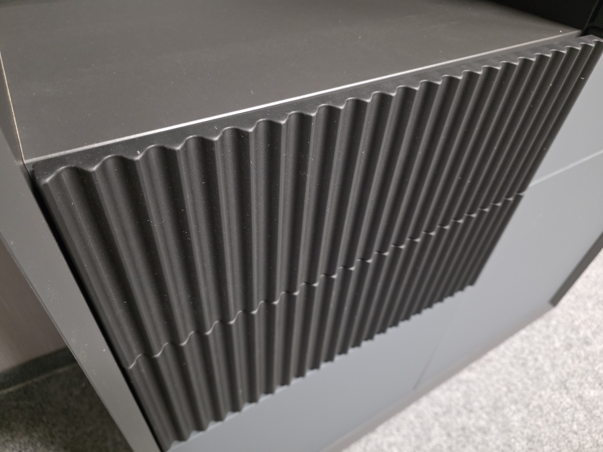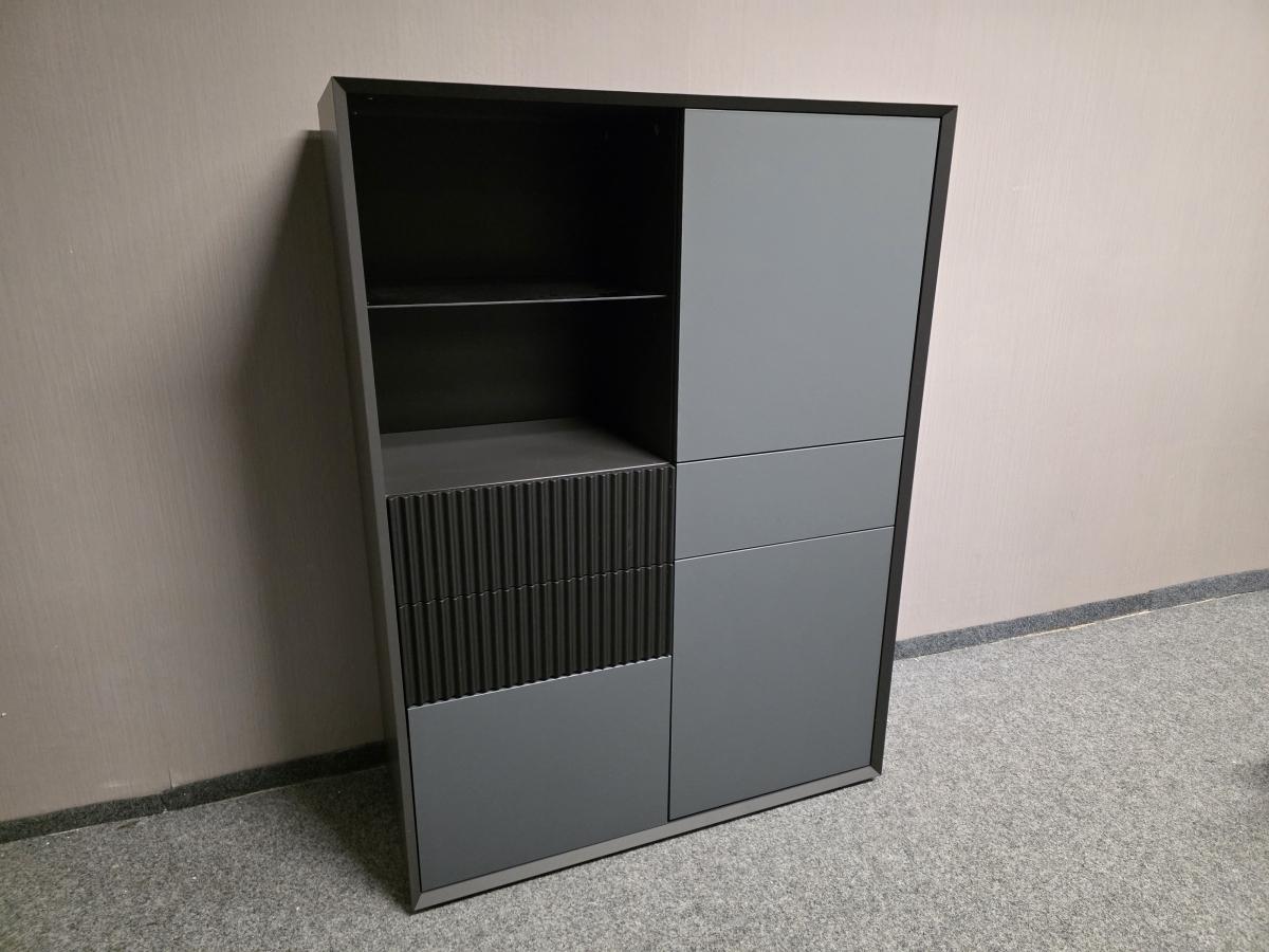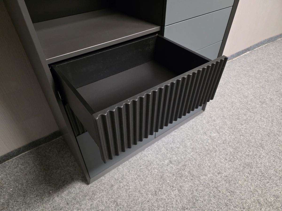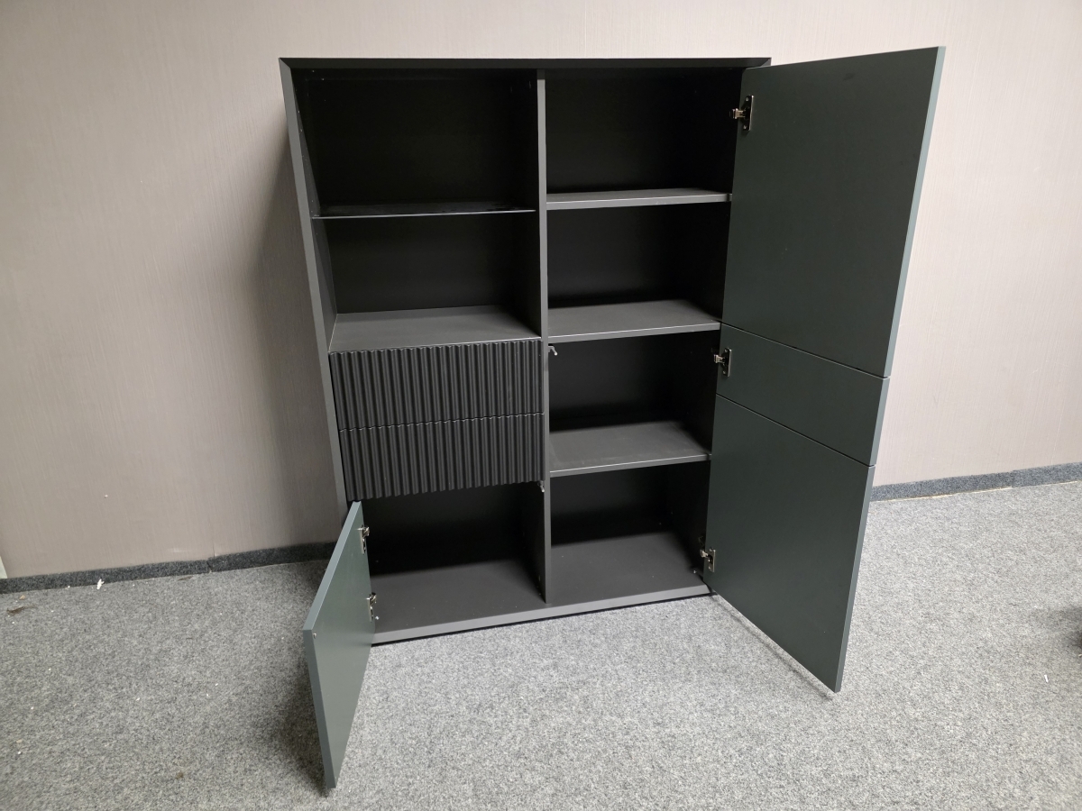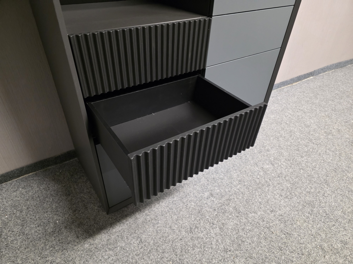 Materiál vysoce kvalitní lamino - samet. Německá značka DIE HAUSMARKE. Dvířka a šuplíky PUSH TO OPEN. Šířka 94 cm, hloubka 40 cm, výška 128 cm. 400P