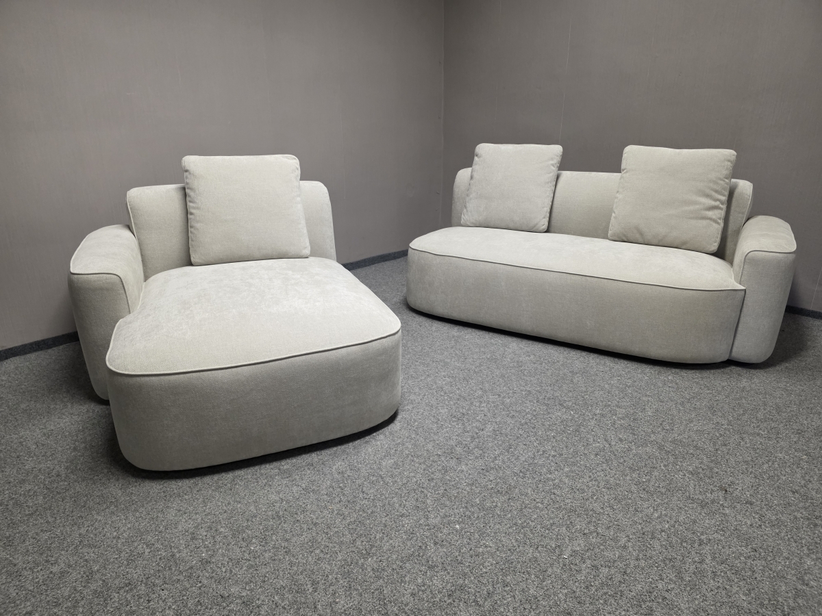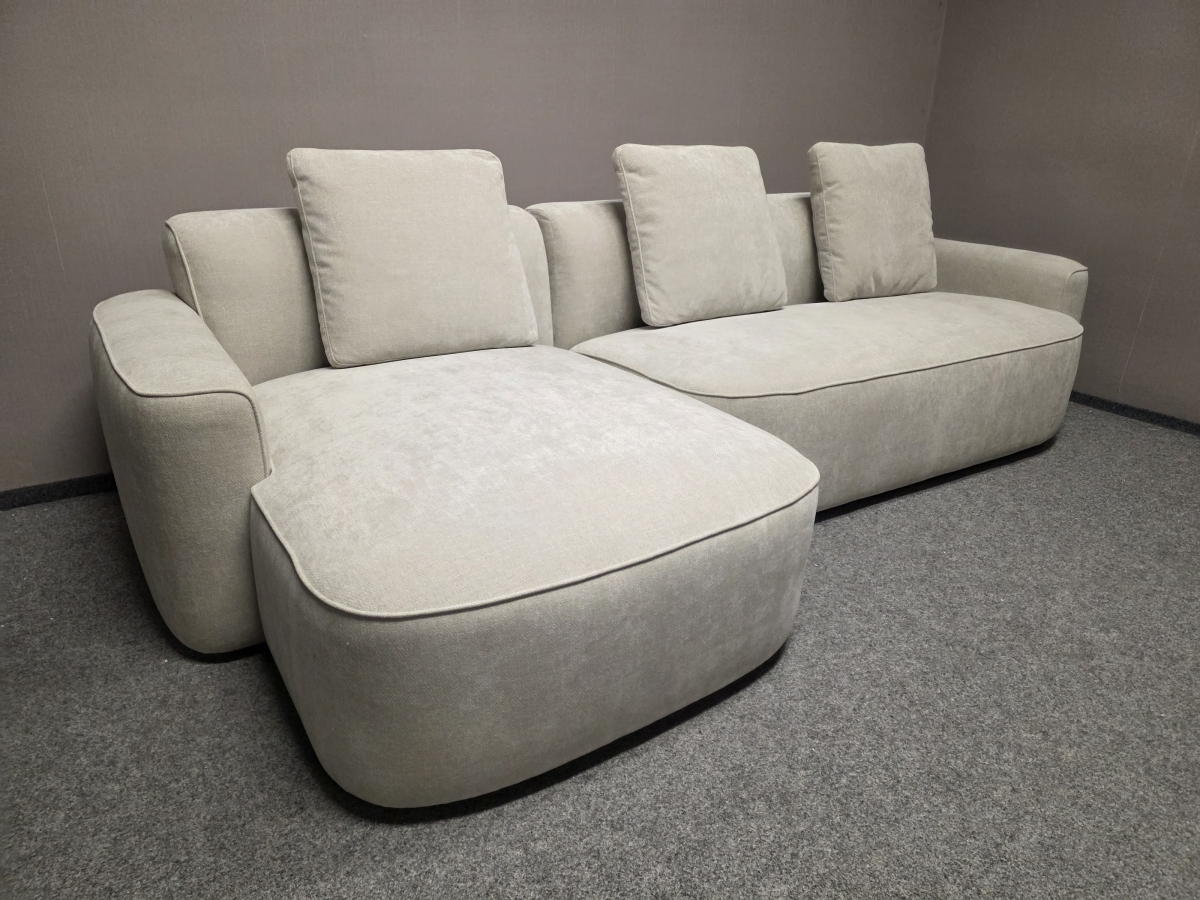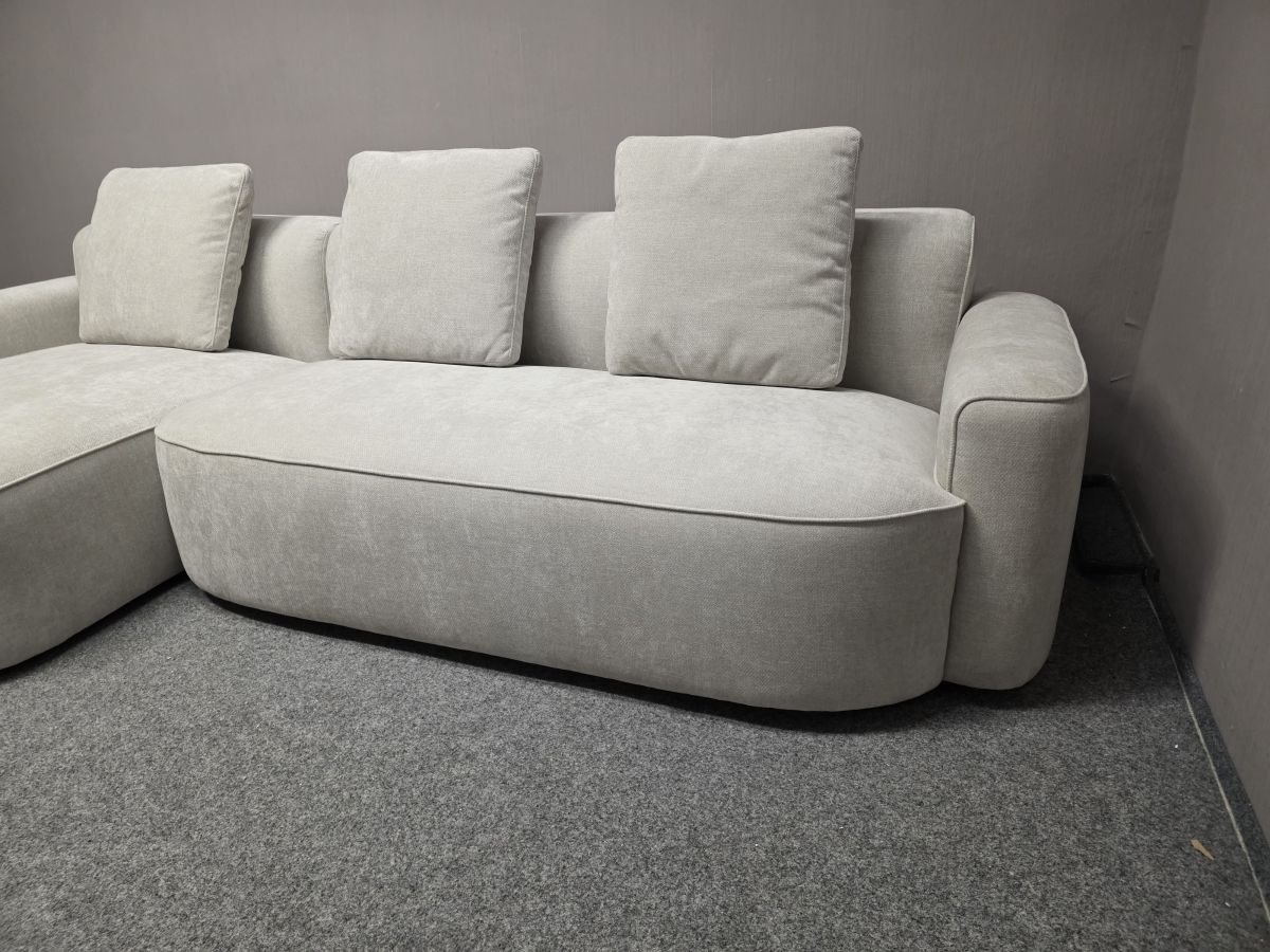 Potah látka 100% polyester, celočalouněné. Nerozkládací, lze postavit samostatně. Cena s polštáři. Zleva: 140x295 cm, výška 73 a 92 cm, výška sedáku: 44 cm, hloubka sedáku: 50-68 cm. Levý gauč: 112x140 cm. Pravý gauč: 100x183 cm.