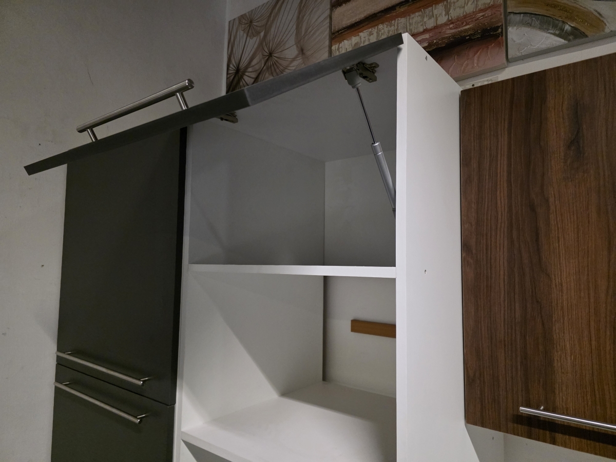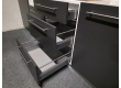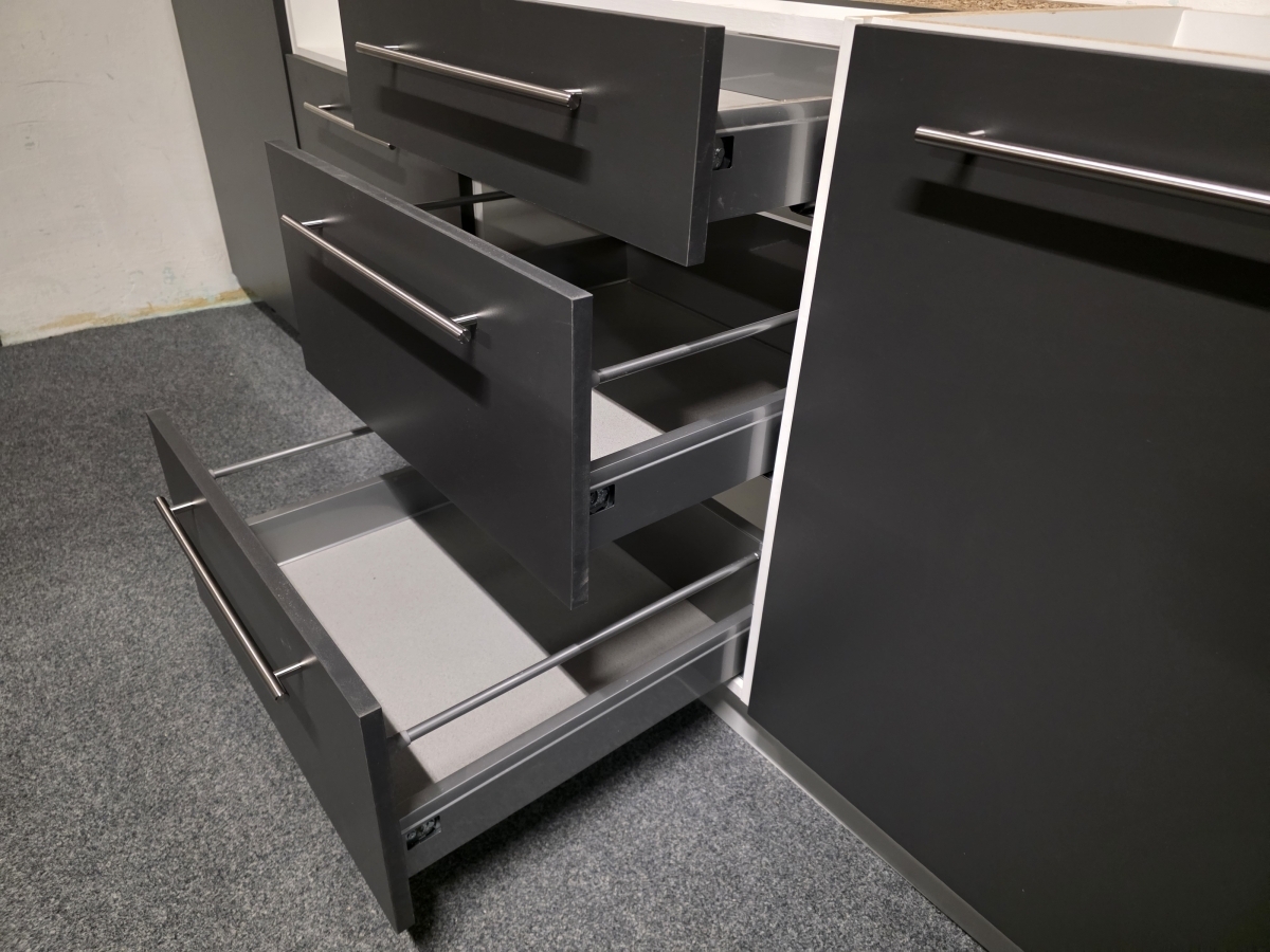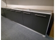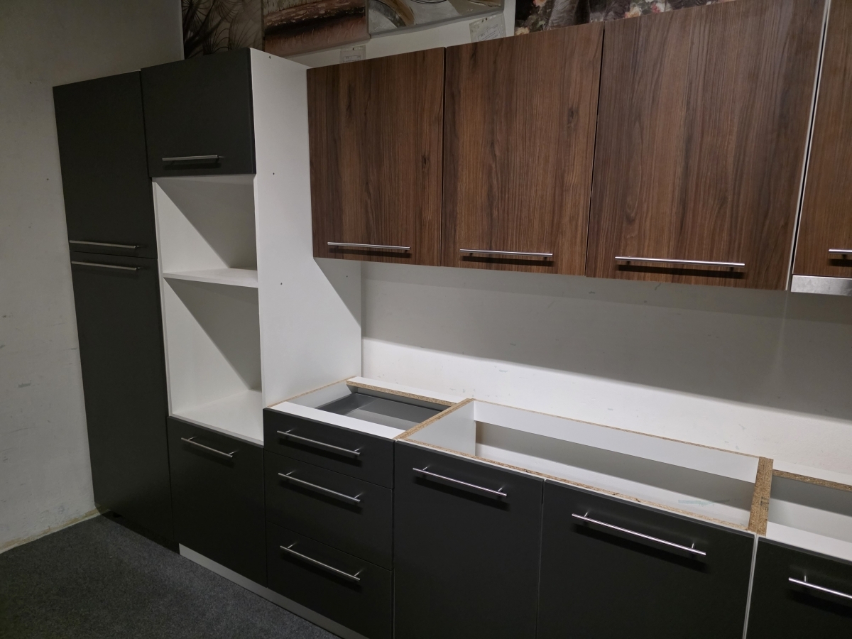 II. jakost (v jedné skříňce oděrky). Materiál lamino mat. Šuplíky s tlumením zavírání. Celková délka: 476 cm. Části: 66 cm skříň na ledničku (potraviny), 60 cm komín na troubu a mikrovlnku. 60 cm šuplíky. 100 cm na dřez. 90 cm s vestavnou digestoří REFSTA. 100 cm skříňka na nádobí.