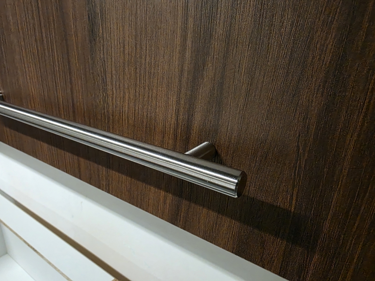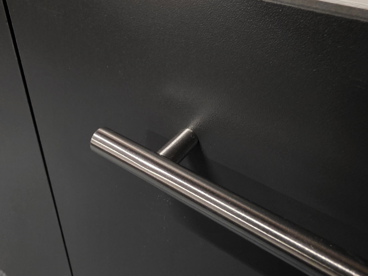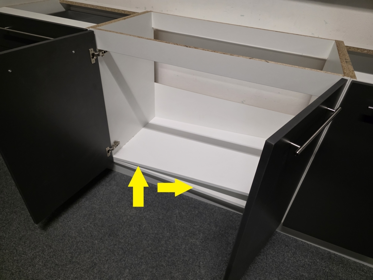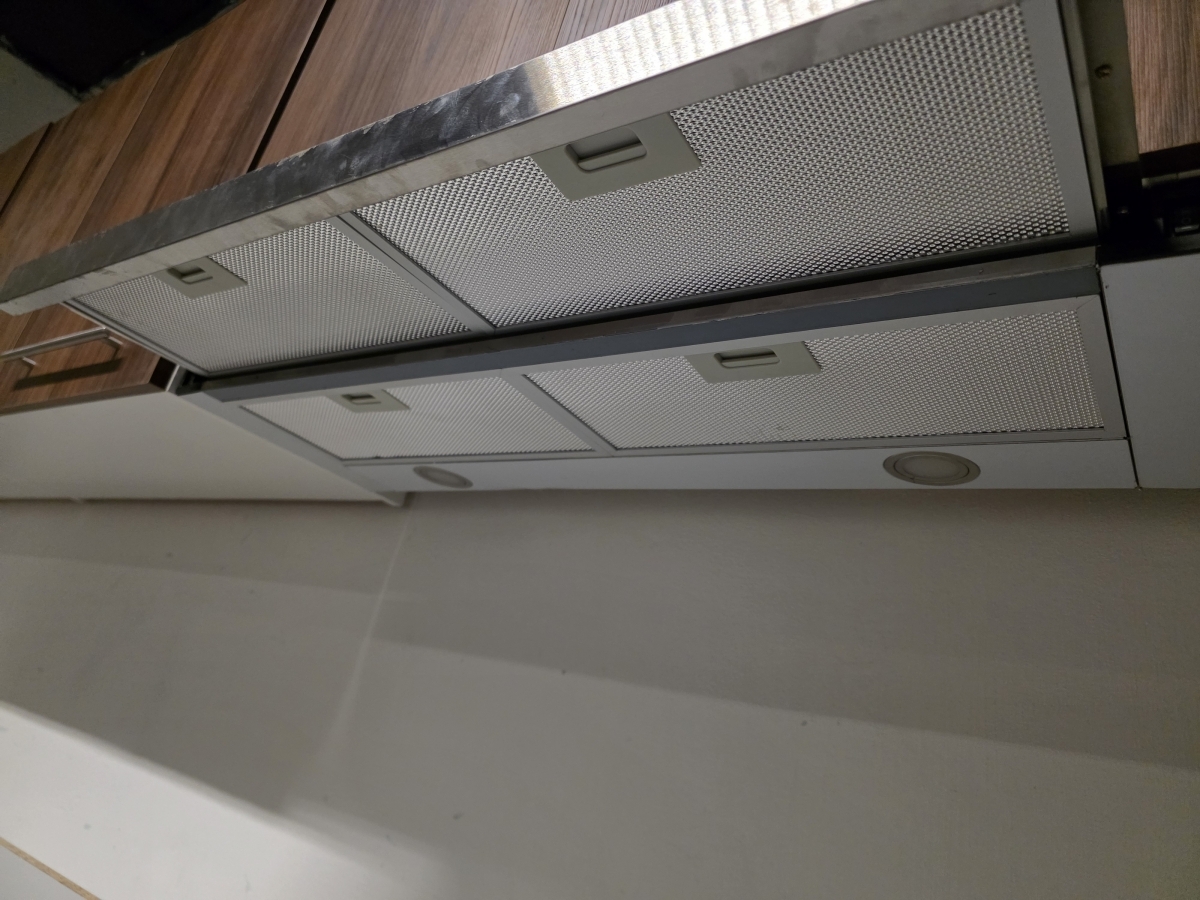 II. jakost (v jedné skříňce oděrky). Materiál lamino mat. Šuplíky s tlumením zavírání. Celková délka: 476 cm. Části: 66 cm skříň na ledničku (potraviny), 60 cm komín na troubu a mikrovlnku. 60 cm šuplíky. 100 cm na dřez. 90 cm s vestavnou digestoří REFSTA. 100 cm skříňka na nádobí.