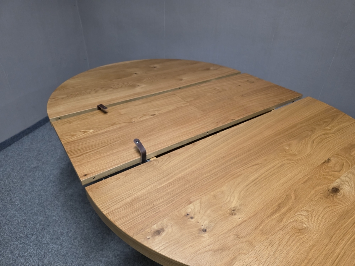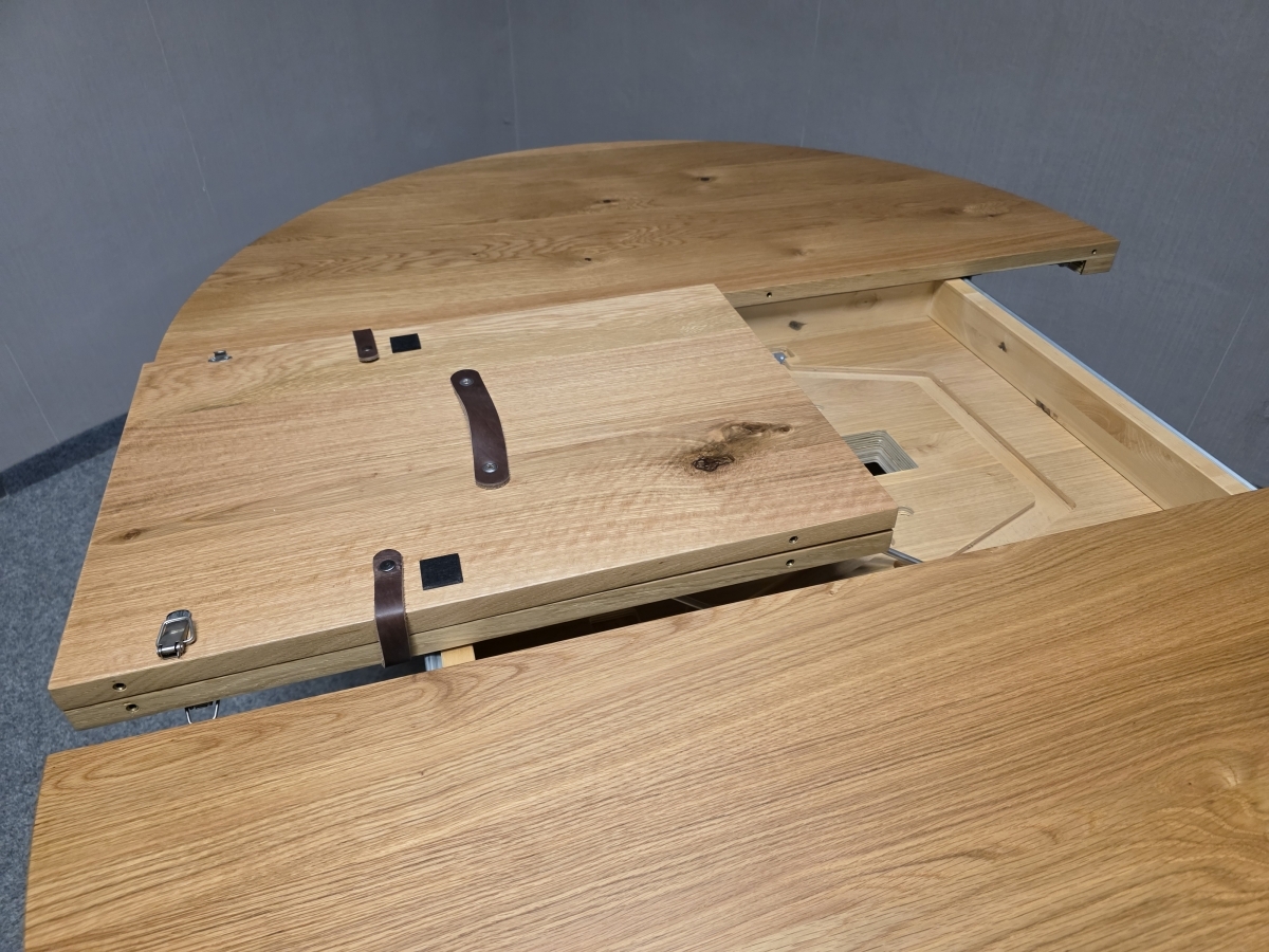 Materiál masiv, dýha. Rozkládací. Průměr desky: 130 cm + 45 cm, výška 77 cm.