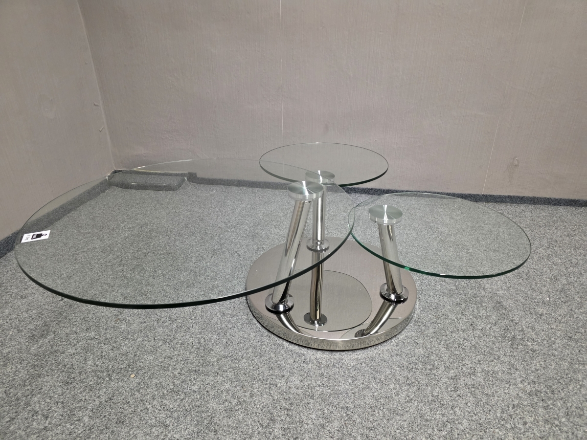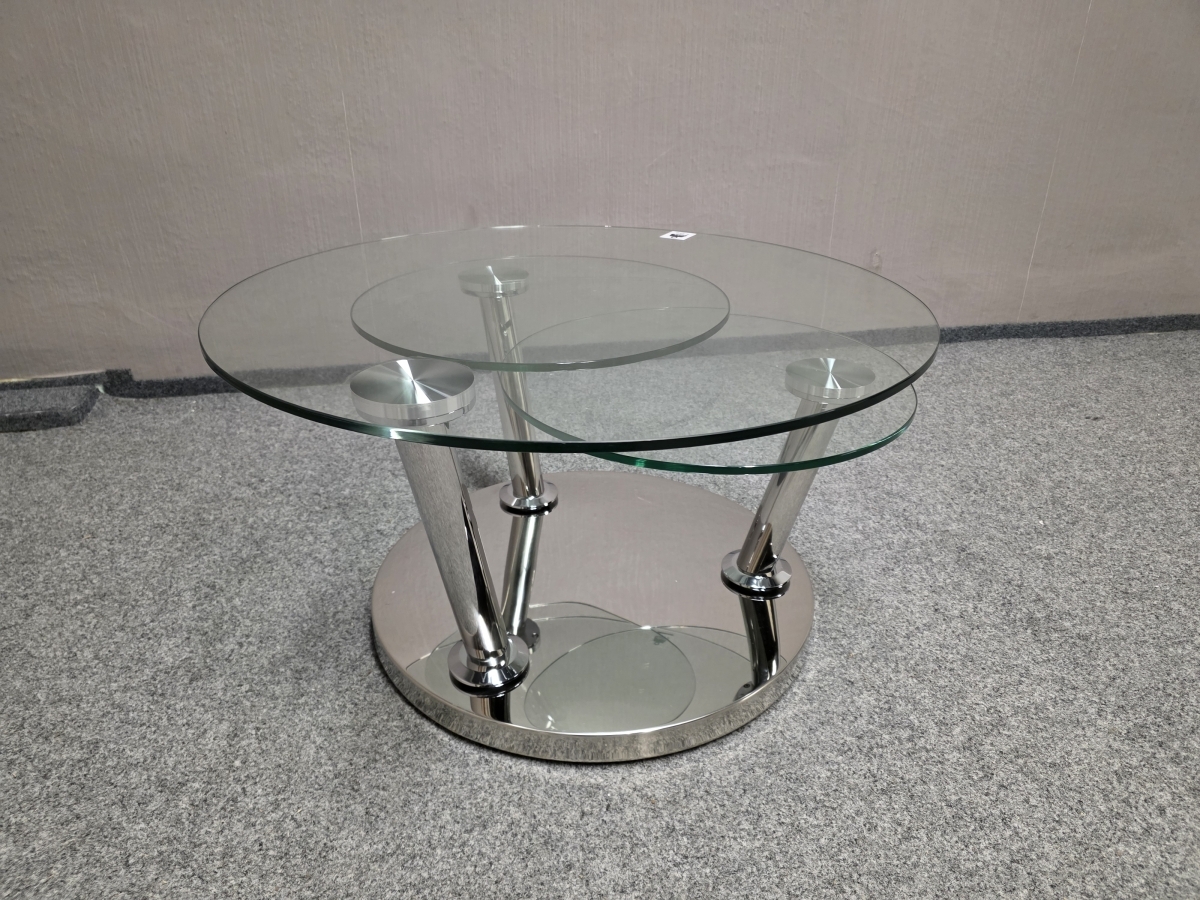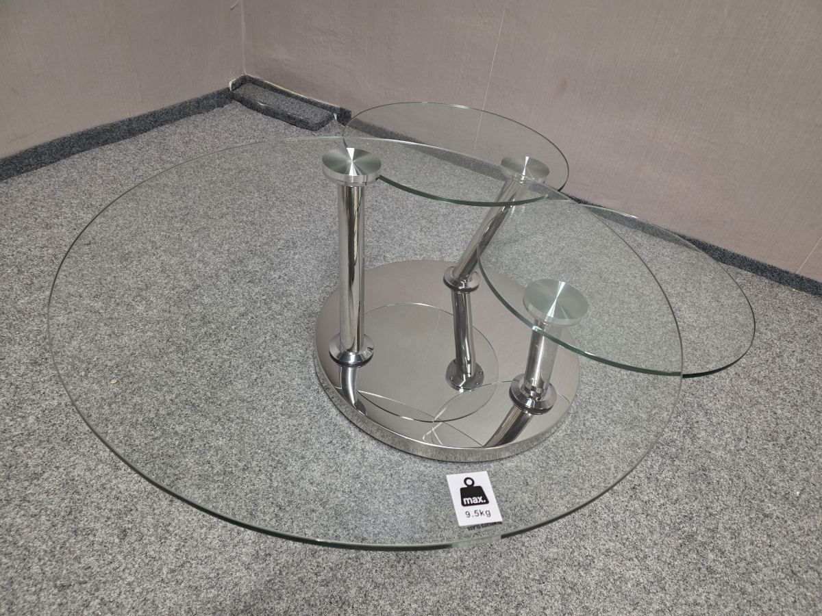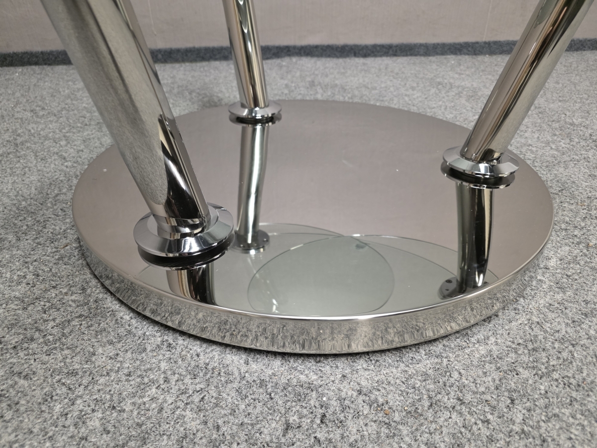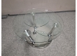 Materiál: kov chrom, bezpečnostní sklo 10 mm. Otočné jednou rukou. Průměr skel: 80 cm, 2x 50 cm, podesta: 60 cm. Výška: 45 cm, 39 cm, 34 cm. 600P
