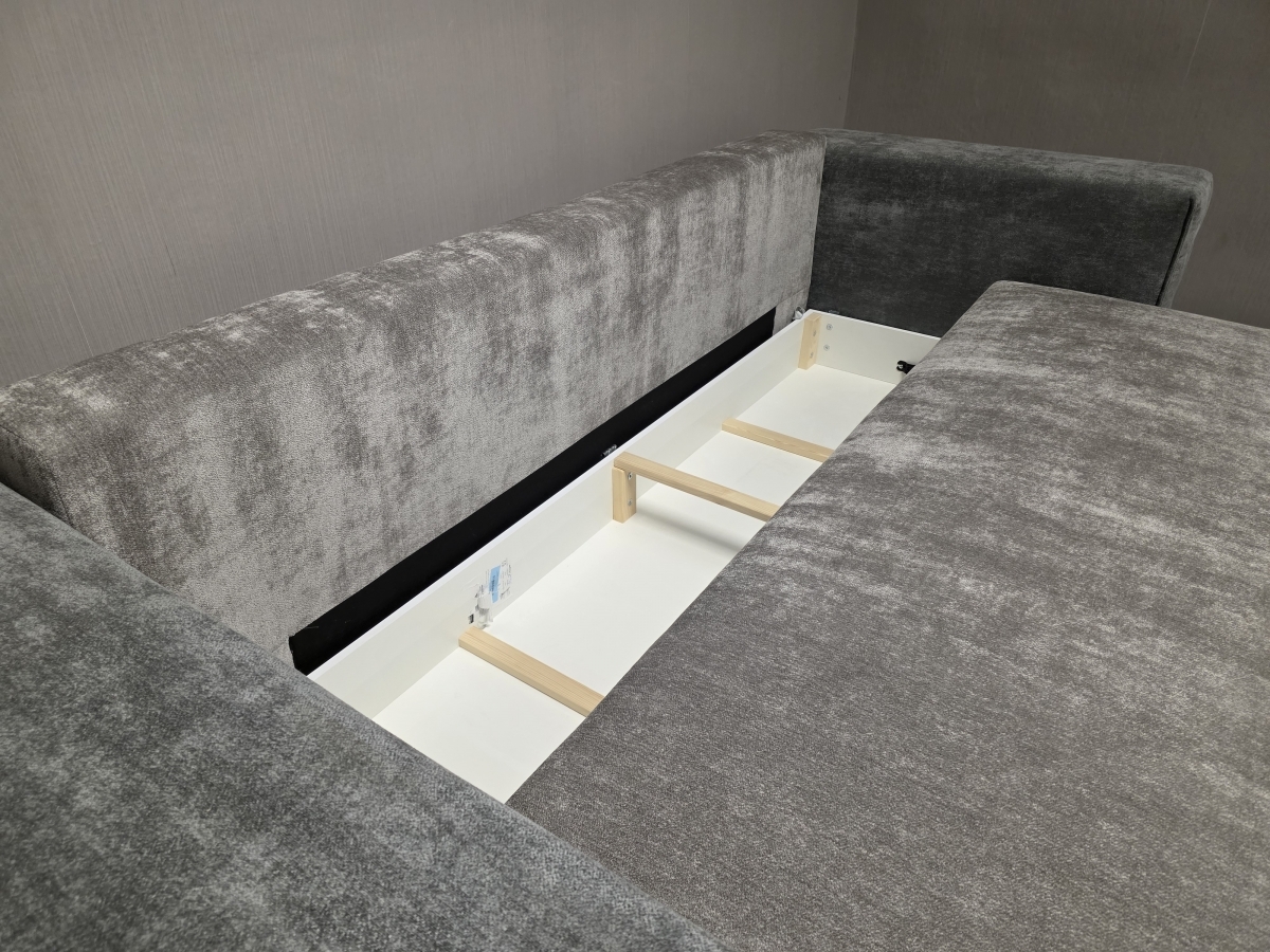 Potah látka, celočalouněné. Rozkládací, úložný prostor. Cena s polštáři. Délka 255 cm, hloubka 103 cm, výška 73-94 cm, lůžko: 150x200 cm, výška sedáku: 44 cm, hloubka sedáku: 63 a 88 cm.