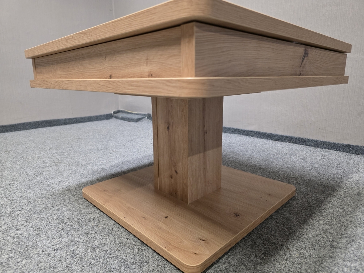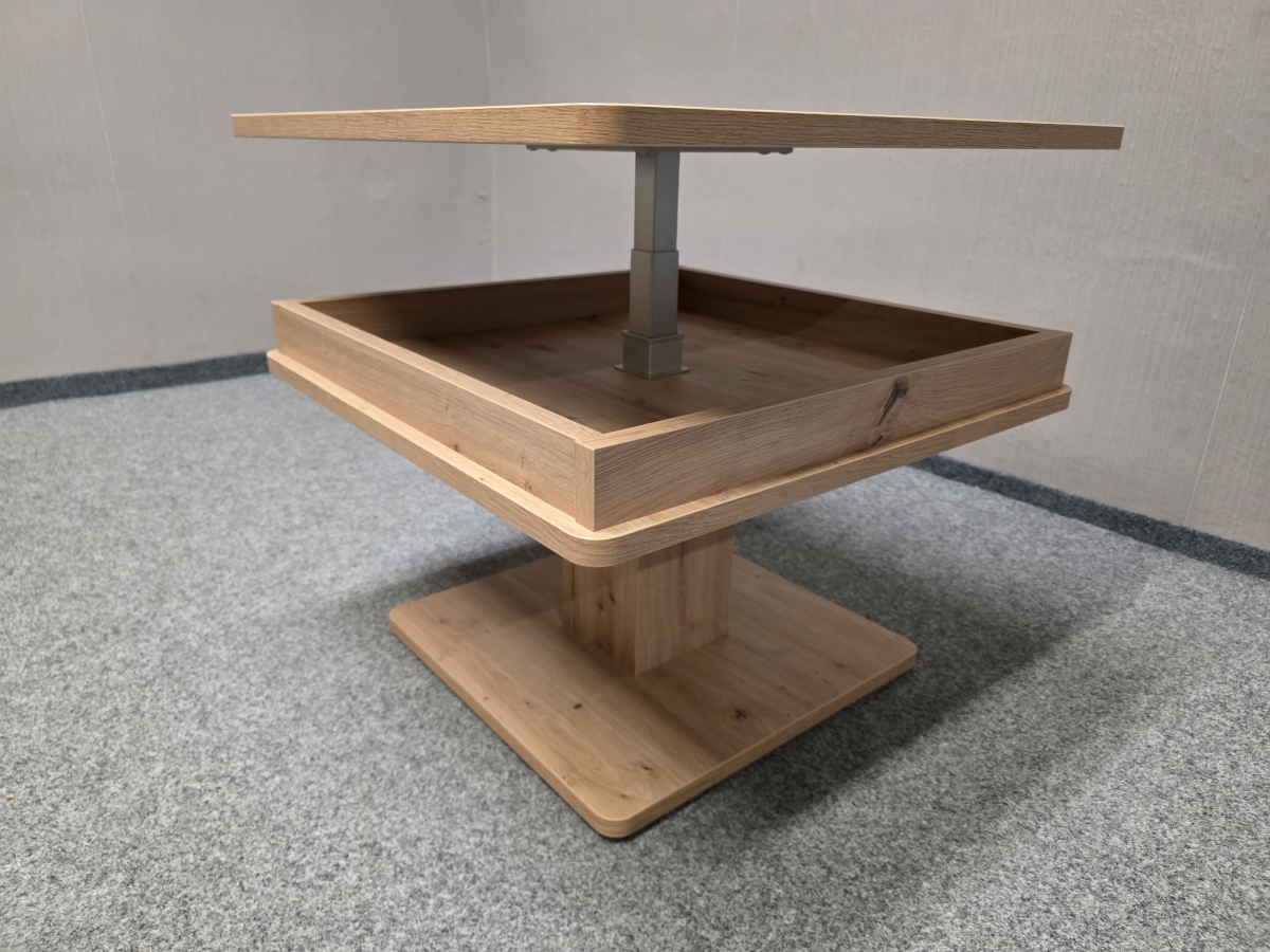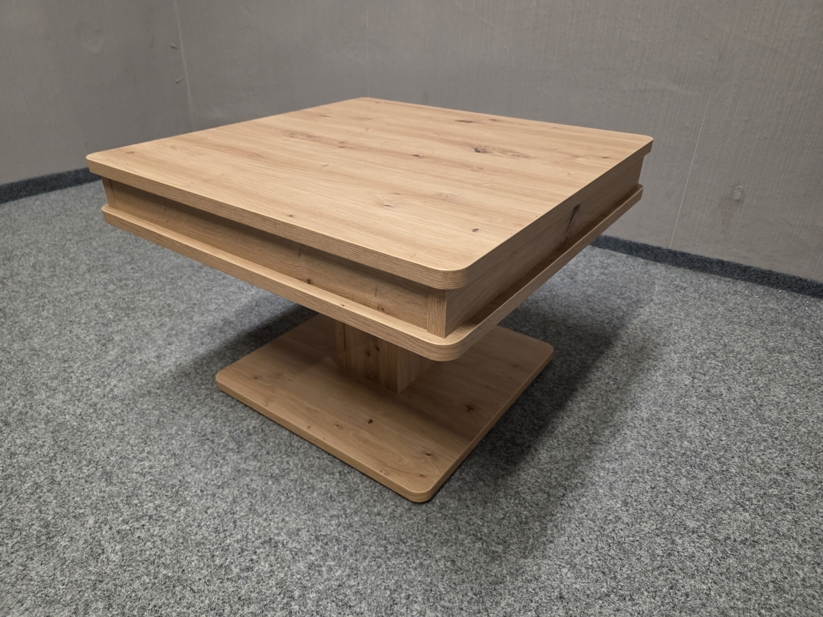 Nové (vystavený kus). Materiál lamino (divoký dub). Zvedací, úložný prostor. 67x67 cm, výška 46-64 cm. 400P