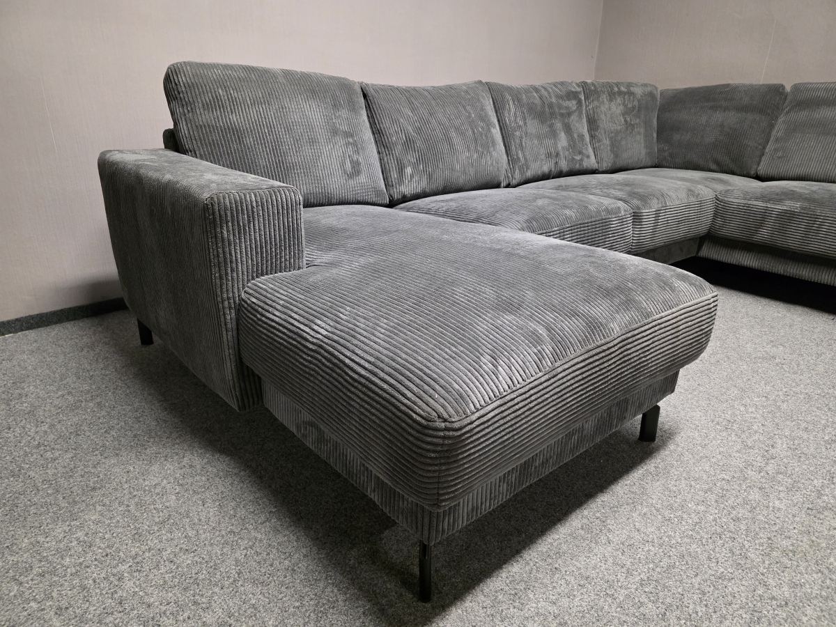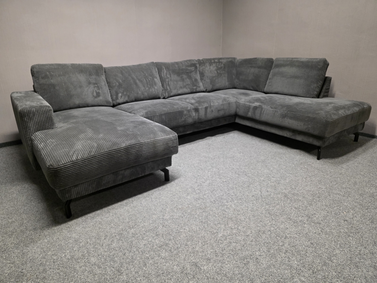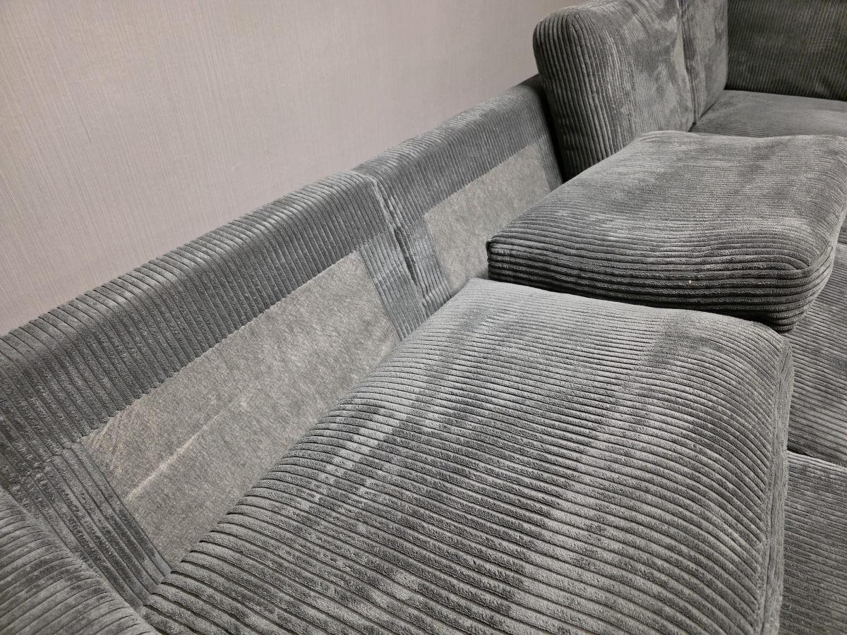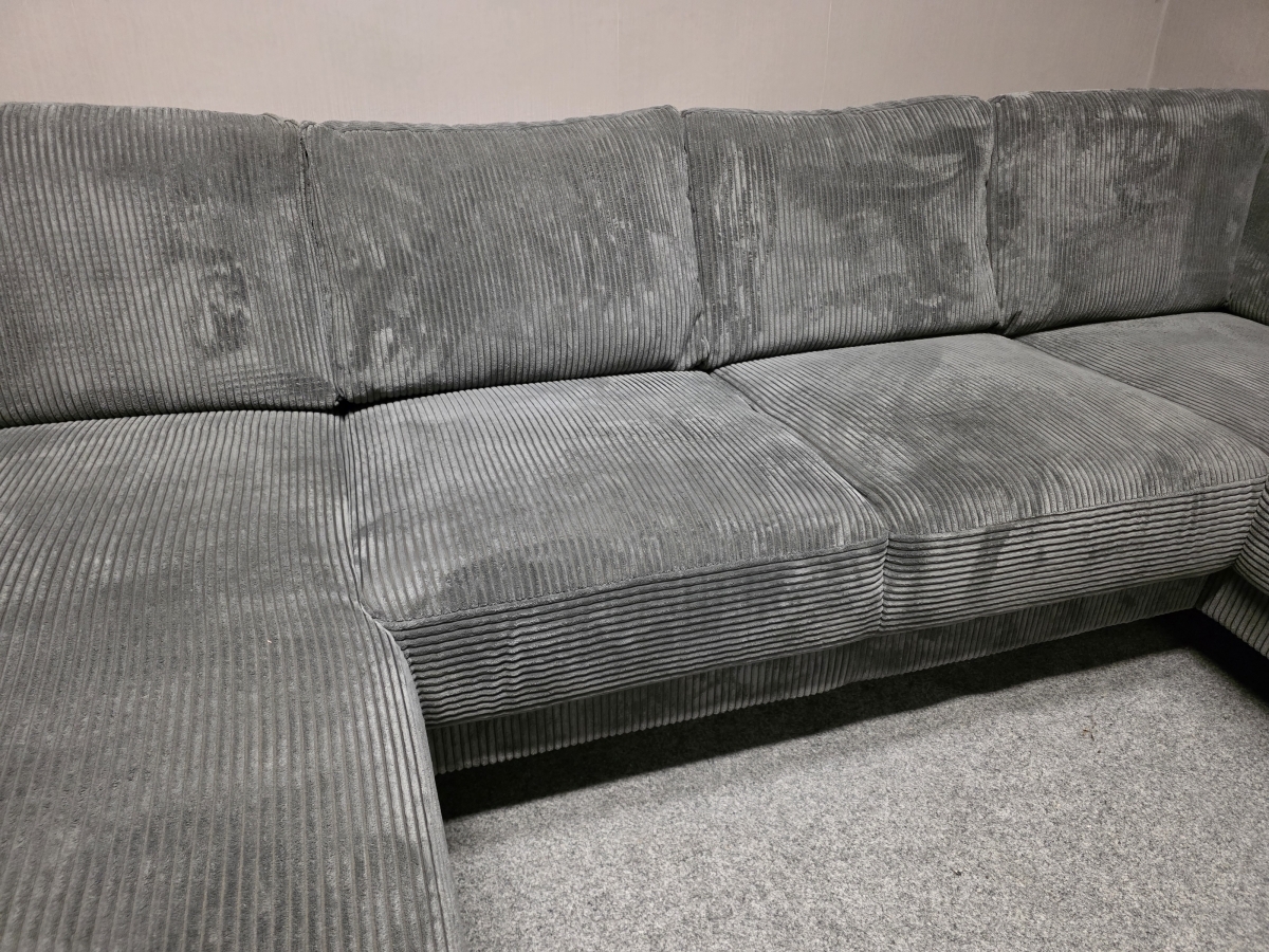 Zánovní (neponičené). Potah látka, celočalouněné. Nerozkládací, sundavací polštáře. Zleva: 150x306x197 cm, výška 69 a 84 cm, výška sedáku: 47 cm, hloubka sedáku: 56-70 cm, prostor pro konferenční stůl: 120 cm, výška nohou: 13 cm.