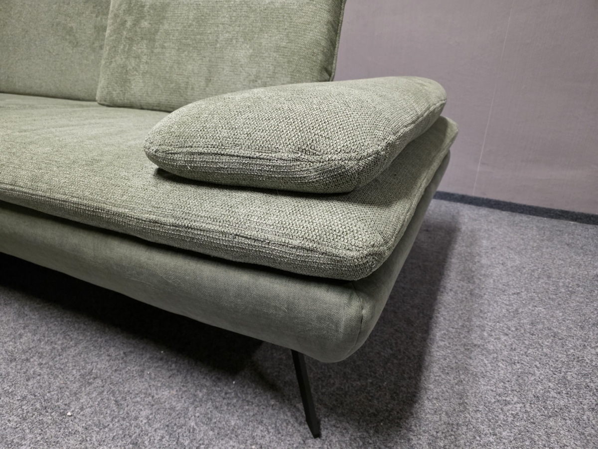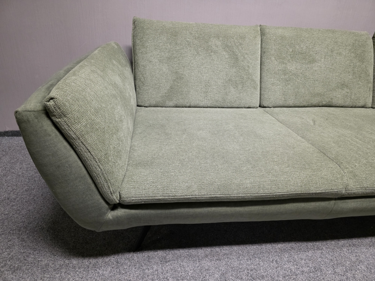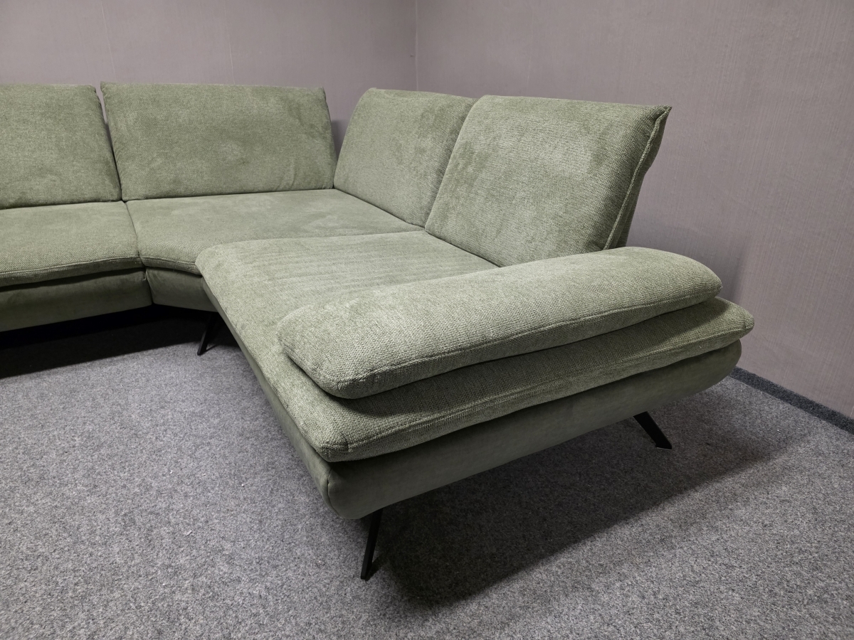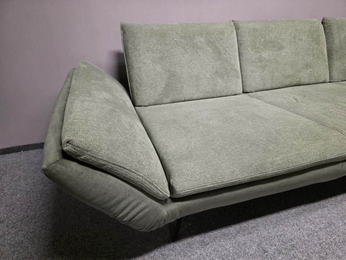Zánovní, neponičené. Potah látka, celočalouněné. Nohy masivní kov. Nerozkládací, posuvná opěradla, polohovací opěrka rukou. Zprava: 244x315 cm, výška 88 cm, výška sedáku: 45 cm, hloubka sedáku: 62 a 80 cm.