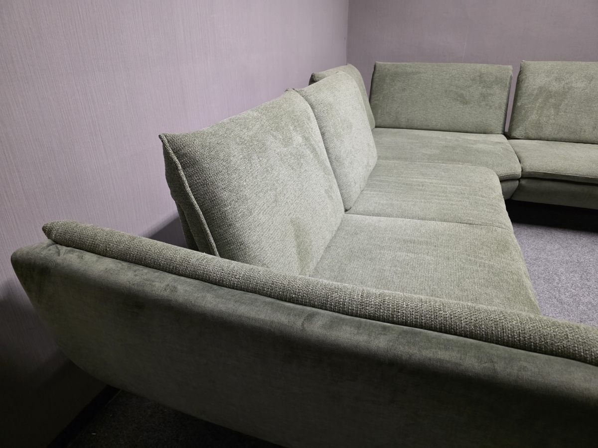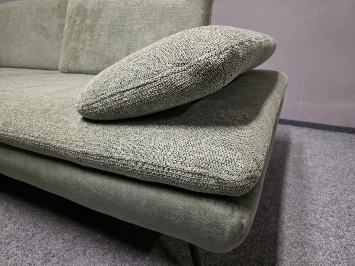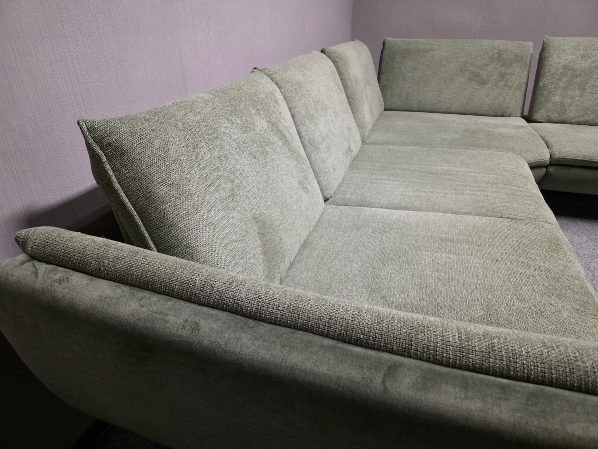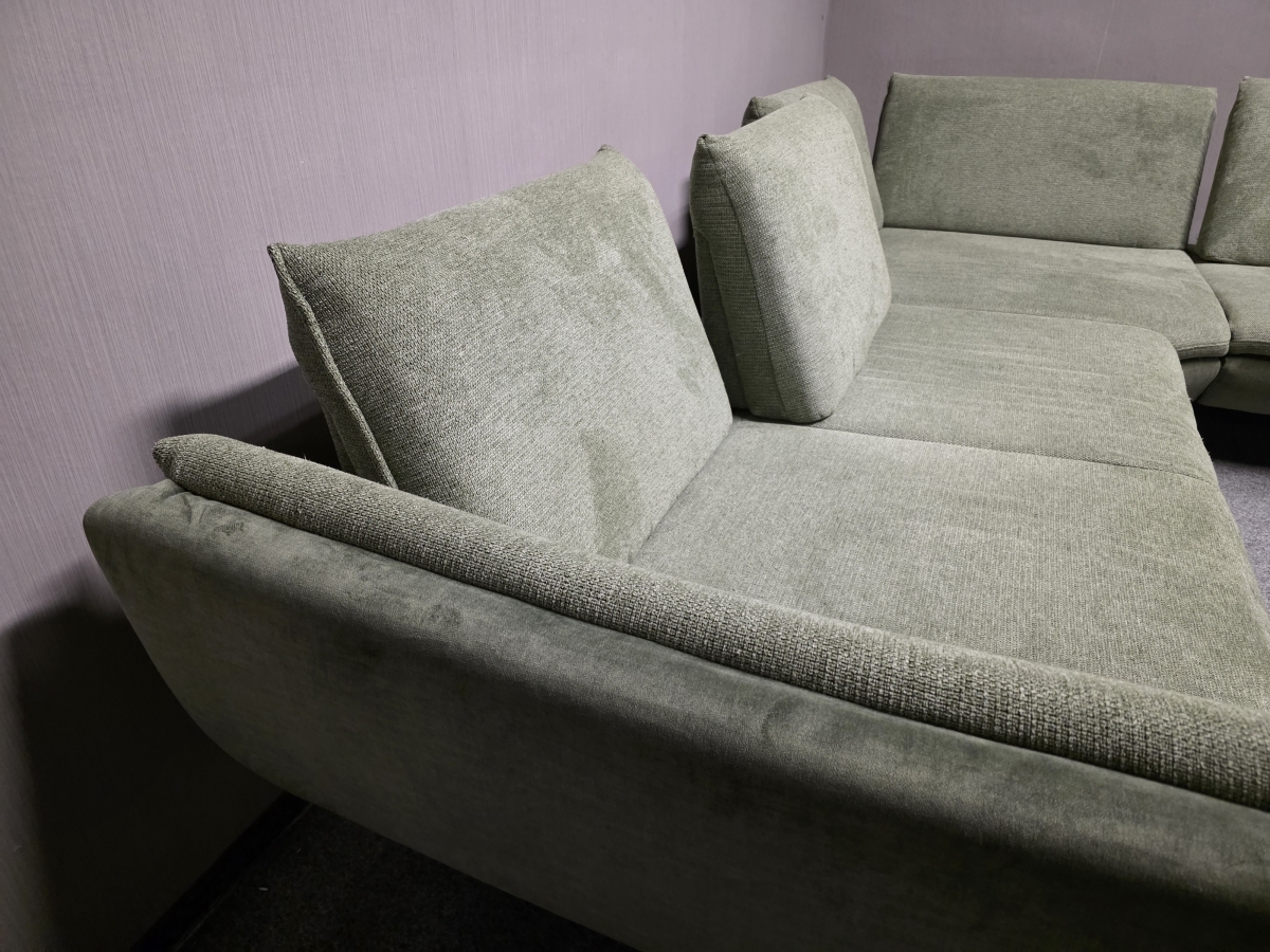 Zánovní, neponičené. Potah látka, celočalouněné. Nohy masivní kov. Nerozkládací, posuvná opěradla, polohovací opěrka rukou. Zprava: 244x315 cm, výška 88 cm, výška sedáku: 45 cm, hloubka sedáku: 62 a 80 cm.