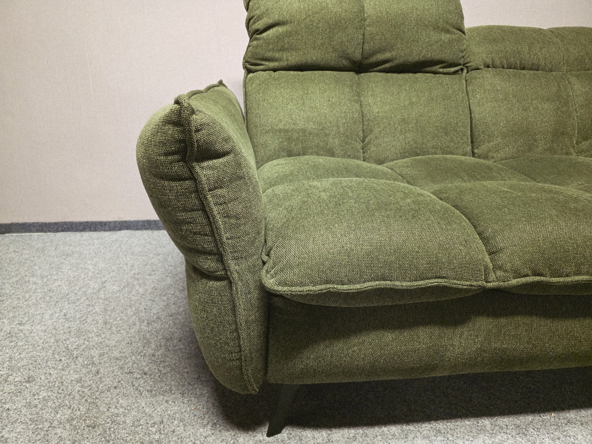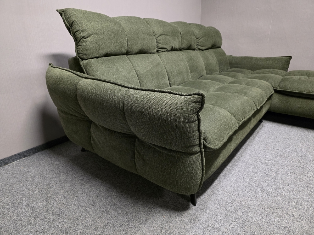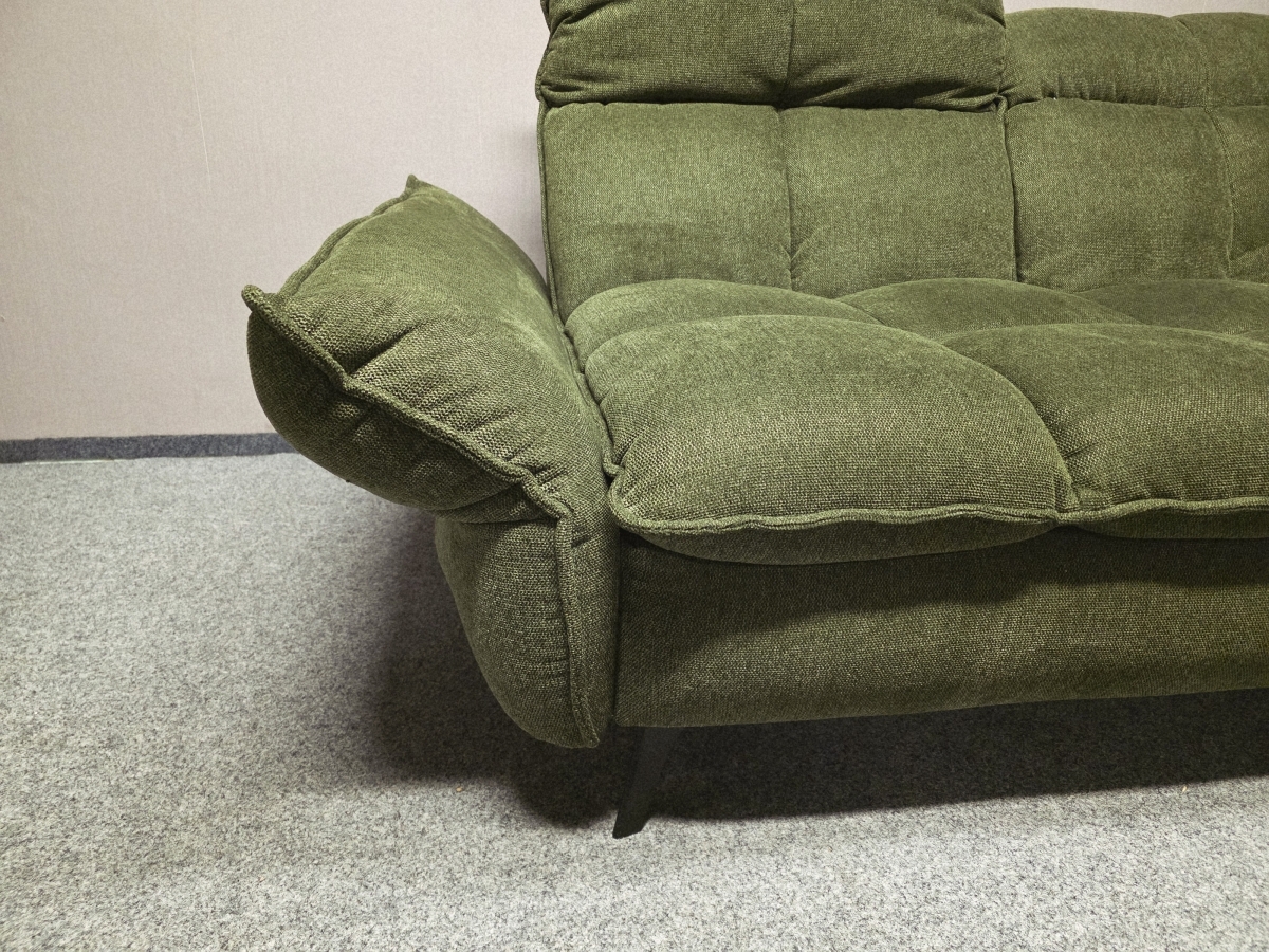 Zánovní, neponičené. Potah silná látka, celočalouněné, Nohy kov. Značka BOBB. Nerozkládací, polohovací opěrky hlavy a rukou. Zprava: 198x275 cm, výška 90-103 cm, výška sedáku: 47 cm, hloubka sedáku: 70 cm, výška nohou: 13 cm.