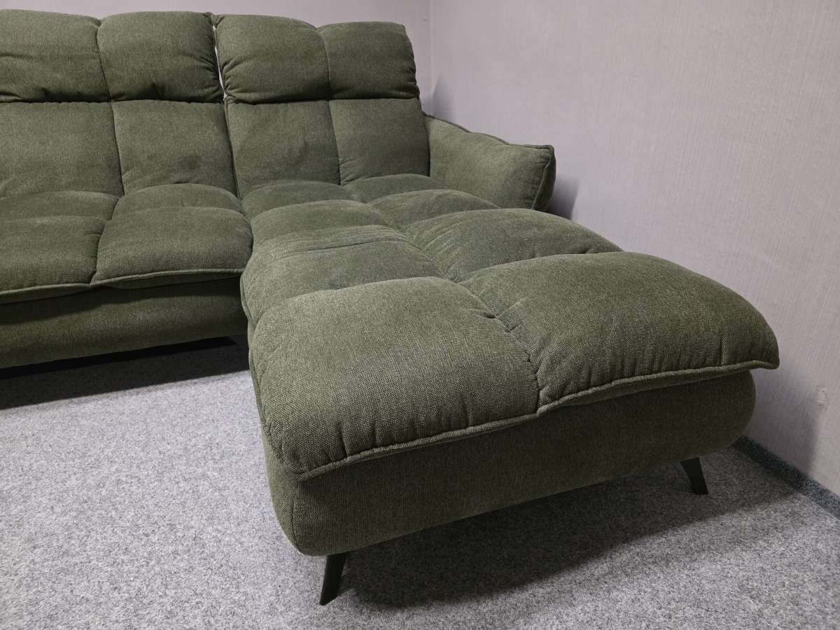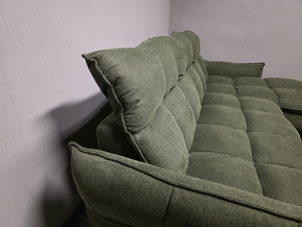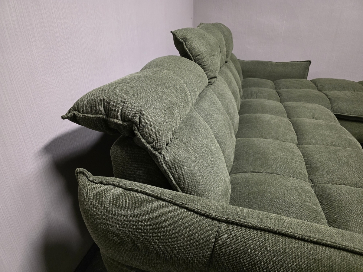 Zánovní, neponičené. Potah silná látka, celočalouněné, Nohy kov. Značka BOBB. Nerozkládací, polohovací opěrky hlavy a rukou. Zprava: 198x275 cm, výška 90-103 cm, výška sedáku: 47 cm, hloubka sedáku: 70 cm, výška nohou: 13 cm.